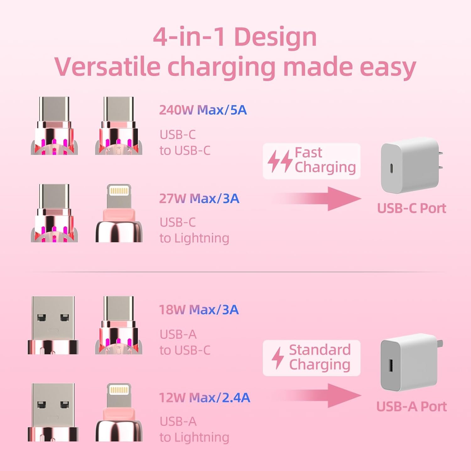 4-in-1 Coiled Universal USB Charging Cable -MAX 240W Fast Charging/Charger Cord with Multi USB Port for iPhone 16/15 14 13 iPad Samsung Galaxy MacBook iPad Tablets and More (Pink, 5.6Ft)