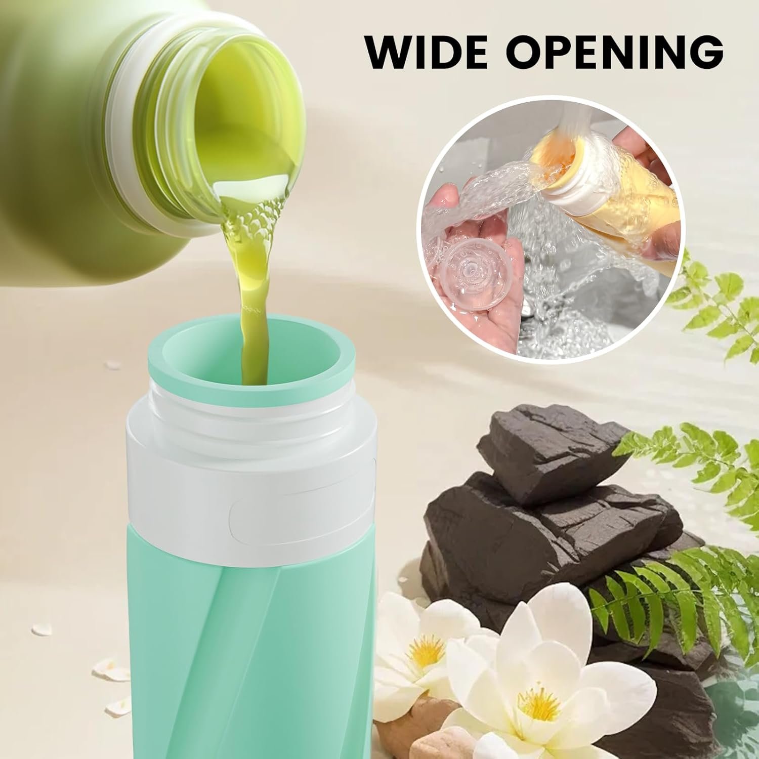 Wide Mouth Design for Easy Filling and Cleaning: This wide opening makes travel shampoo and conditioner bottles easier to fill with thicker fluid, and the silicone travel containers for toiletries easily use the brush to clean the inside of the bottle. 4 different colors choices make travel bottles for toiletries easy to distinguish between different fillings