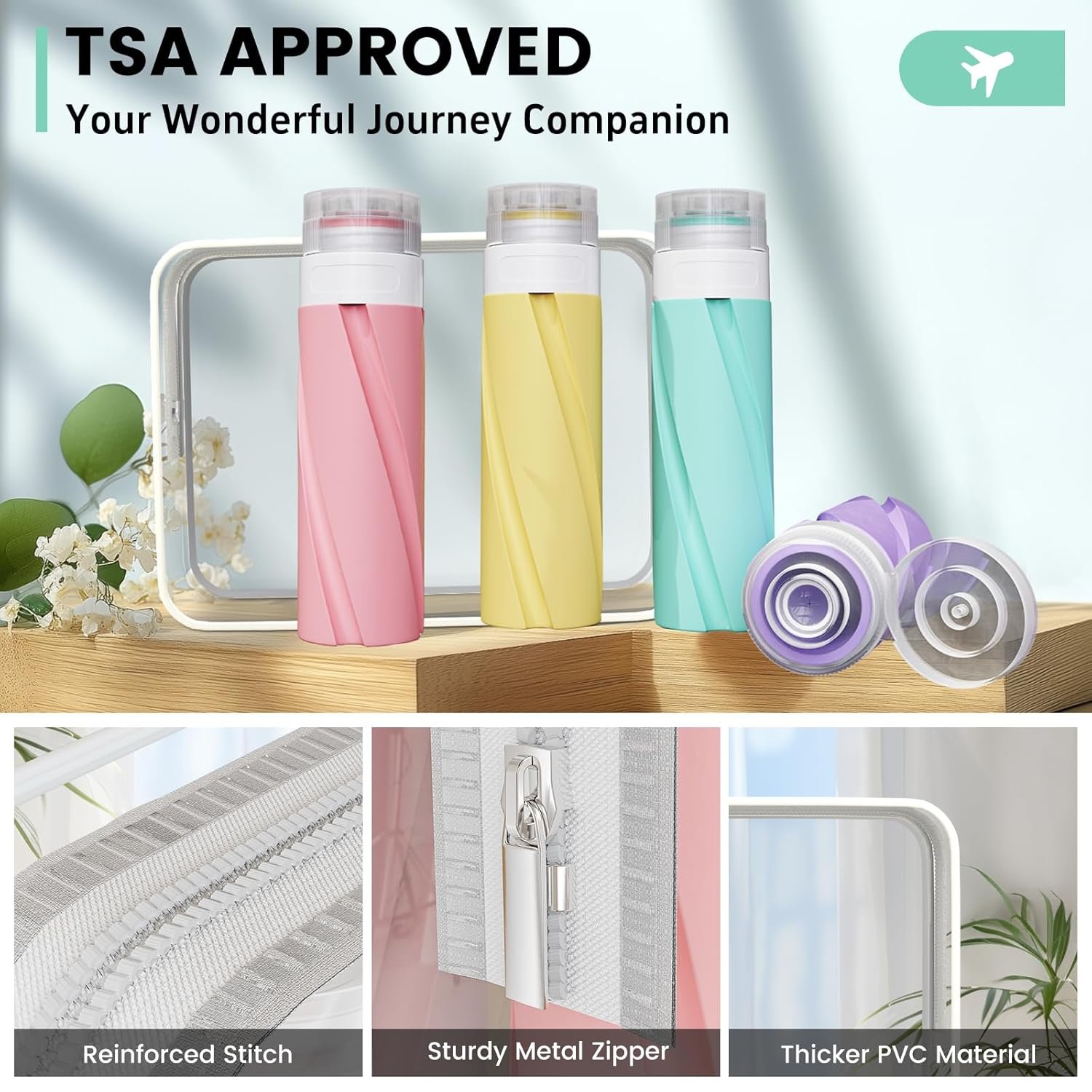 Useful Travel Accessories: TSA Approved silicone 3.4oz travel size bottles are great for gym shower, travel, camping, cruises, the fitness center, airplane or the dorm. These travel bottles are perfect for various cosmetics, toiletries portable, compact, easy solution to security check-ins. A must for your life or travelling