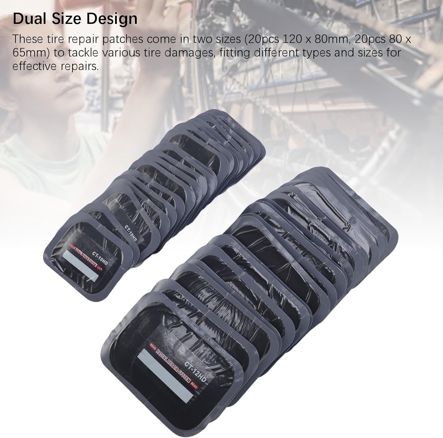 Dual Size Design: These tire repair patches come in two sizes (20pcs 120 x 80mm, 20pcs 80 x 65mm) to tackle various tire damages, fitting different types and sizes for effective repairs