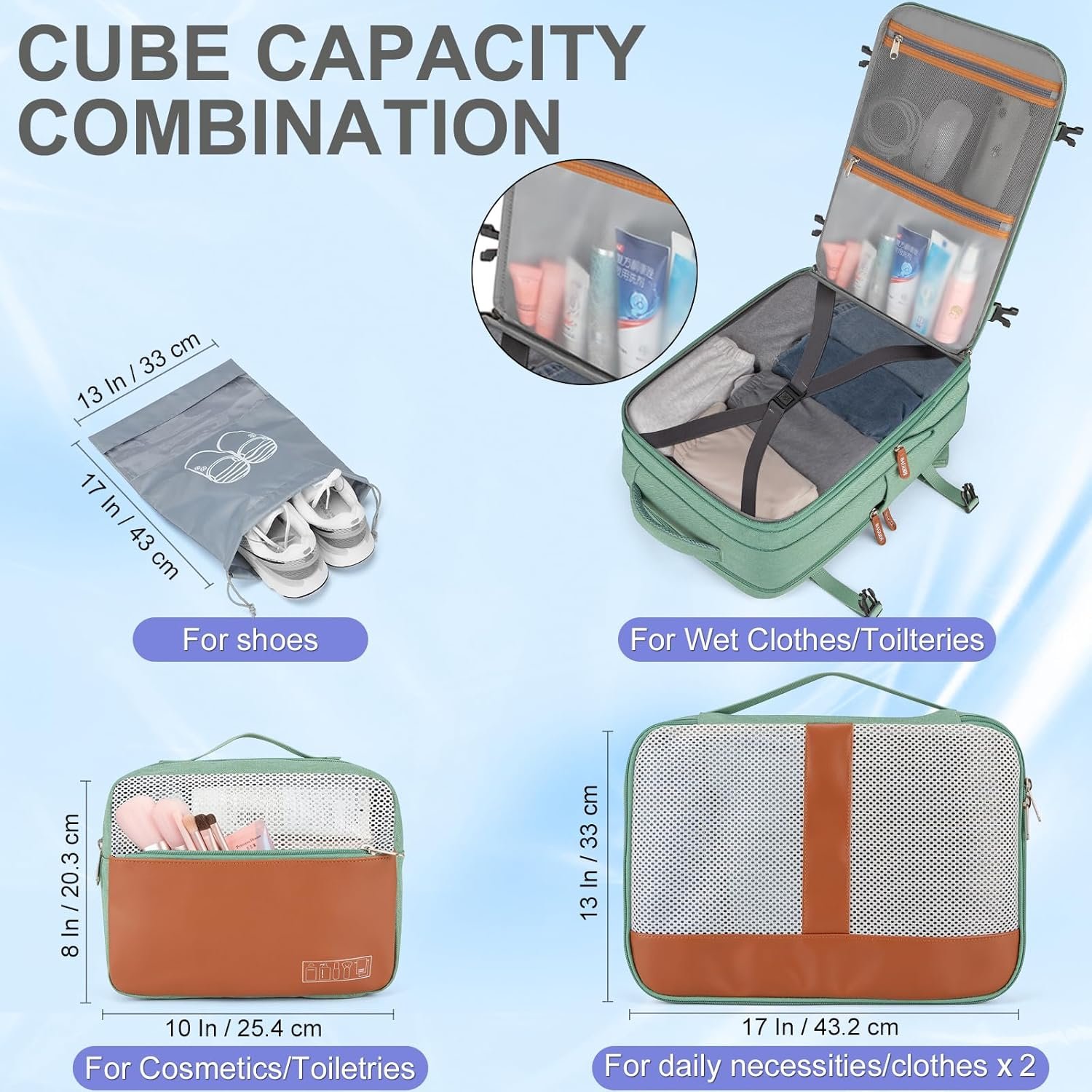 ✈【Packing Cubes & Wet/Dry Separation】: Includes 3 packing cubes (2 for clothing and accessories, 1 for shoes up to 16.5 inches in length). A high-density waterproof pocket keeps toiletries or wet clothes separated, maintaining cleanliness and order during your trip. The shoe bag ensures your footwear stays organized and separate.
