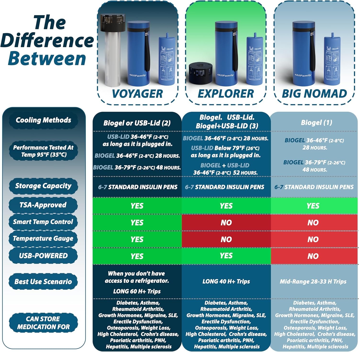 4ALLFAMILY Explorer Insulin Cooler Travel Case TSA Approved 72H (1–7 Medication Pens) – On–The–Go Medical Cooler with Biogel Ice Pack – Diabetes Travel Case for Insulin Pens & EpiPens (Blue)