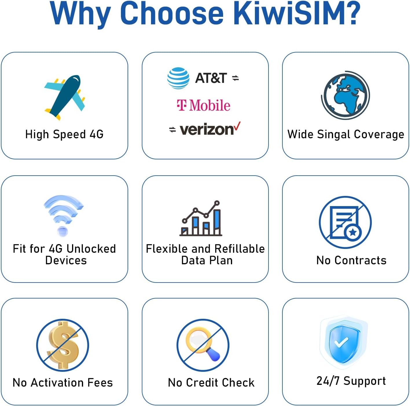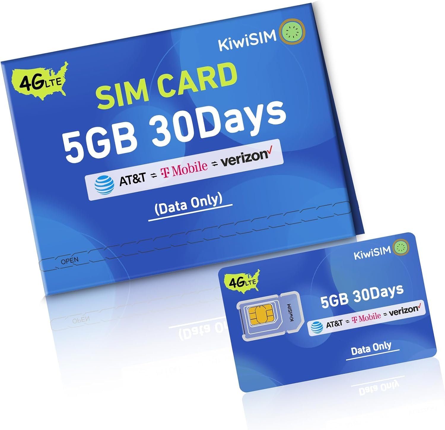 【Support AT&T, T-Mobile and Verizon】The 4G LTE prepaid sim card supports the networks of major U.S. carriers AT&T, T-Mobile, and Verizon. 5GB of data is valid for use across the United States for 30 days. KiwiSIM data card automatically selects the best network to provide coverage based on your location.The SIM card data only is applicable across the entire United States.