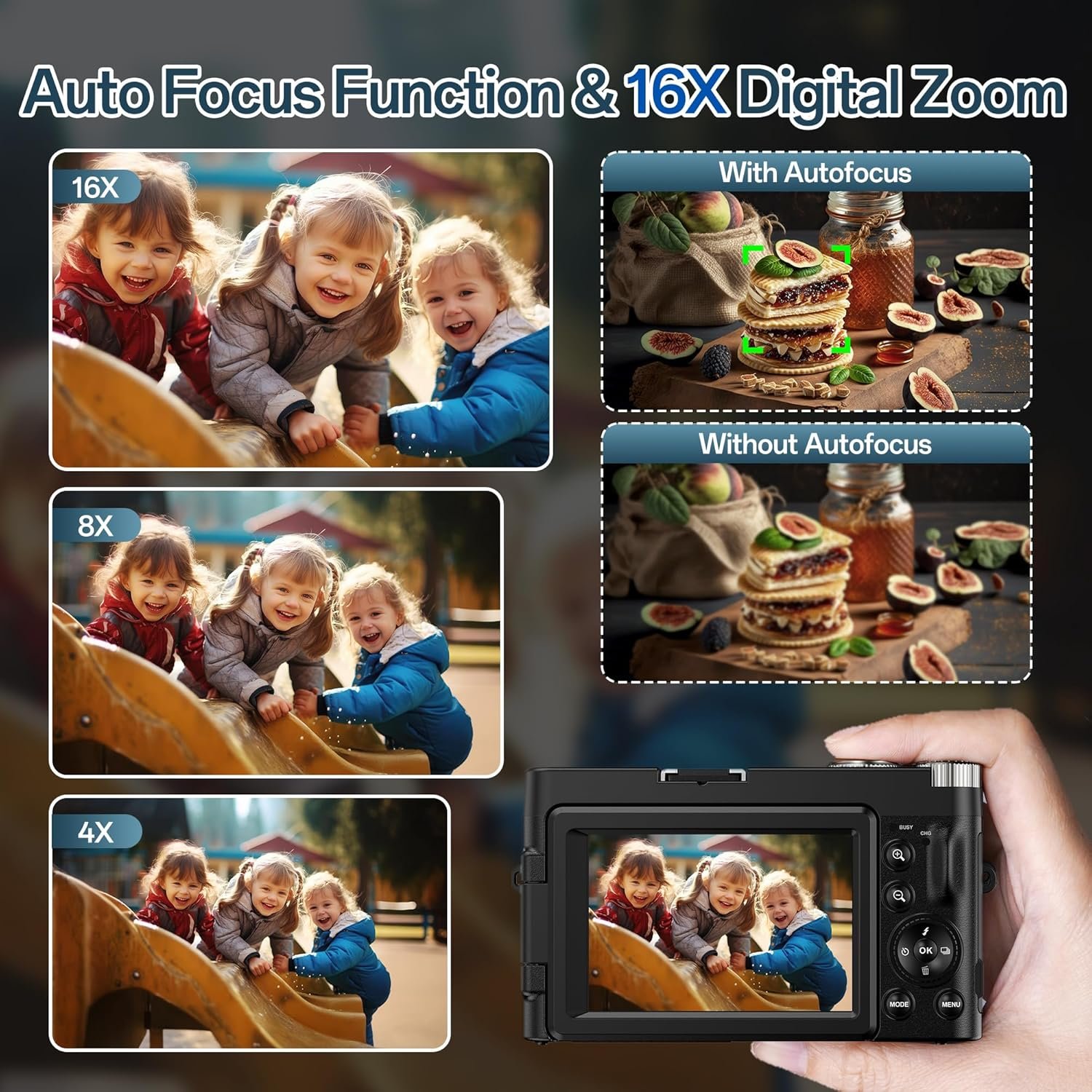 【Autofocus Digital Camera & 3” 180° Flip Screen】— This cameras for photography has an autofocus function and 180-degree flip screen make 4k camera extremely user-friendly, especially for vlogging or taking selfies. The autofocus is reliable, even in moving situations or capturing static scenery, so you won’t have to worry about blurry images, The flip screen to be very handy, as it allows you to see yourself while recording, ensuring that you’re always in frame. This Vlogging Camera is a ideal choice for those doing YouTube videos or live streaming, and it makes the process of shooting much smoother