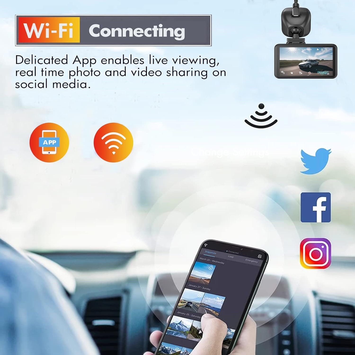 4K Front and 2K Rear Dash cam with Wifi function, Super Night Vision, Loop Recording,24 hour Parking Mode, Screen Saver and Support APP.