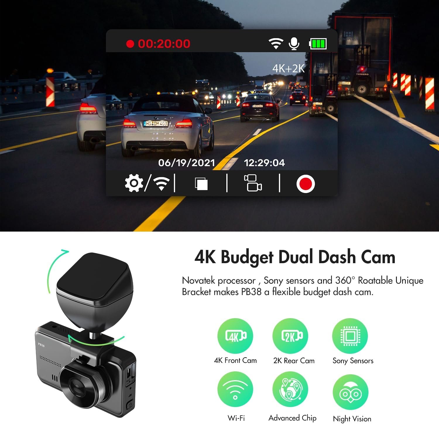 4K High-end Dash Cam Front and Rear Adopted with Novatek processor and MOS sensors, beautiful form factor and reliable build quality, making it an a-list premium budget dash cam 2-Channel Dash Cam The front, rear lens record simultaneously in 4K, 2K video, offering you exceptional video quality. Great for those drivers who pursue high quality images Wi-Fi ConnectionIt supports app connection which allows you to control the dashcam on your phone. Easy to view and download the images. 170+150Wide Angle The car camera has a front lens(170 degree angle) that captures everything on the road aheadwhile the rear camera(150 degree angle) records what is happening back the vehicle, helping with insurance claims. Smart 24-Hour Parking Monitoring The dash cam will automatically turn on and start recording a 30-second locked video when anycollision or vibration is detected, providing 24Hr protection for your car. What’s Included in the Box? 1*dash cam(Front and Rear) 1*car charger1*user manual 1* bracket 1*Trim Pry Tool 4*Cable Fixer 1*Electrostatic Film 2*Double-sided Adhesive