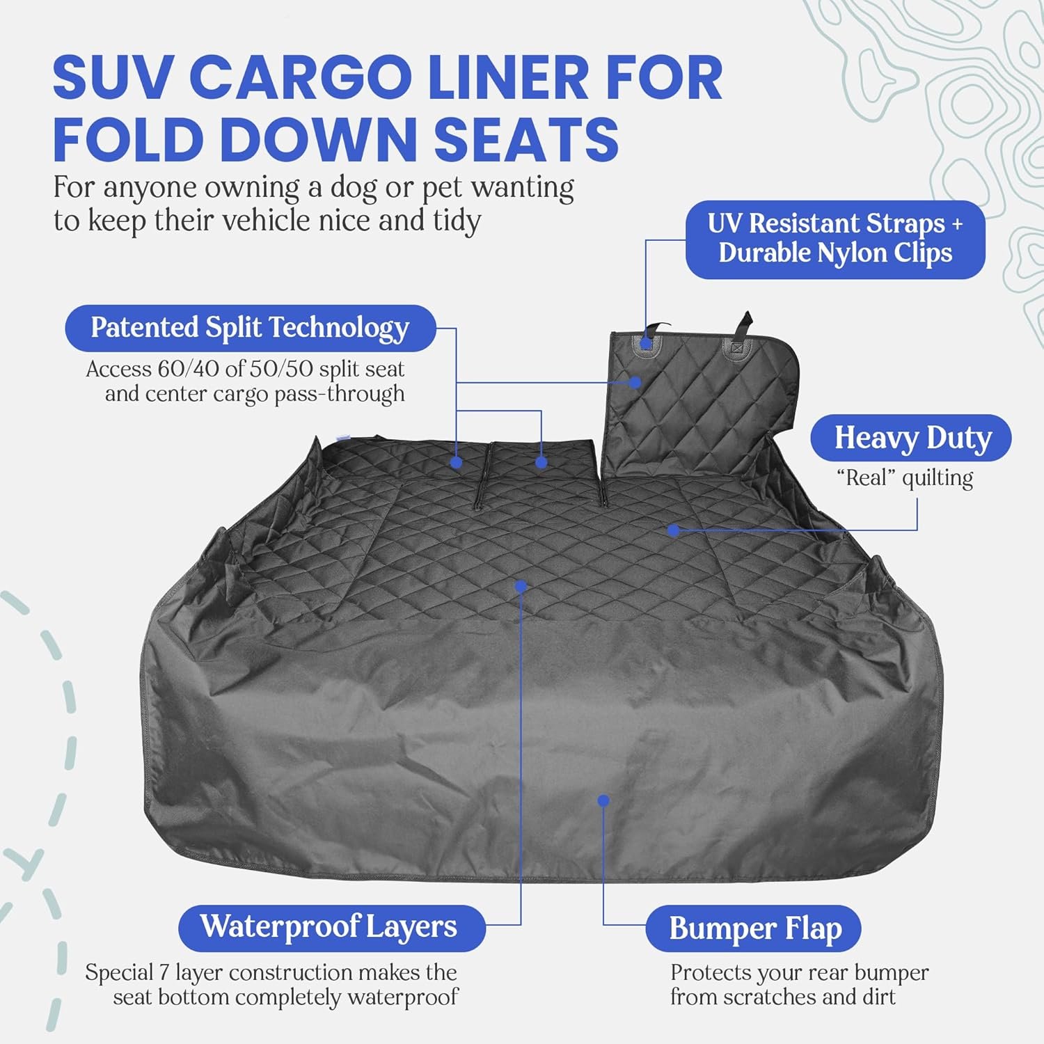 BUILT TO LAST WITH PREMIUM MATERIALS: Made with heavy-duty 600D polyester and reinforced with thick UV-coated straps, our dog cargo liner for SUVs offers superior durability. Nylon clips provide a strong, secure hold to keep the cover in place during travel. Ideal for everyday protection (not chew-proof).