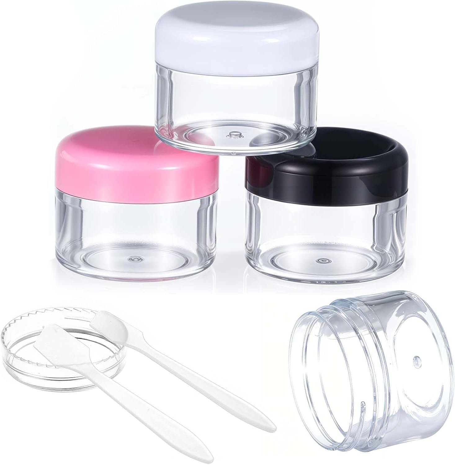 【Small Travel Containers】: These small travel containers are compact and easy to carry, making them ideal for any travel adventure. With dimensions of 4*3.2cm for the jars and 8.2cm for the spoon, they fit comfortably in your carry-on luggage, purse, or backpack. The variety of colors – black, white, pink, and clear – adds a touch of style to your travel essentials.