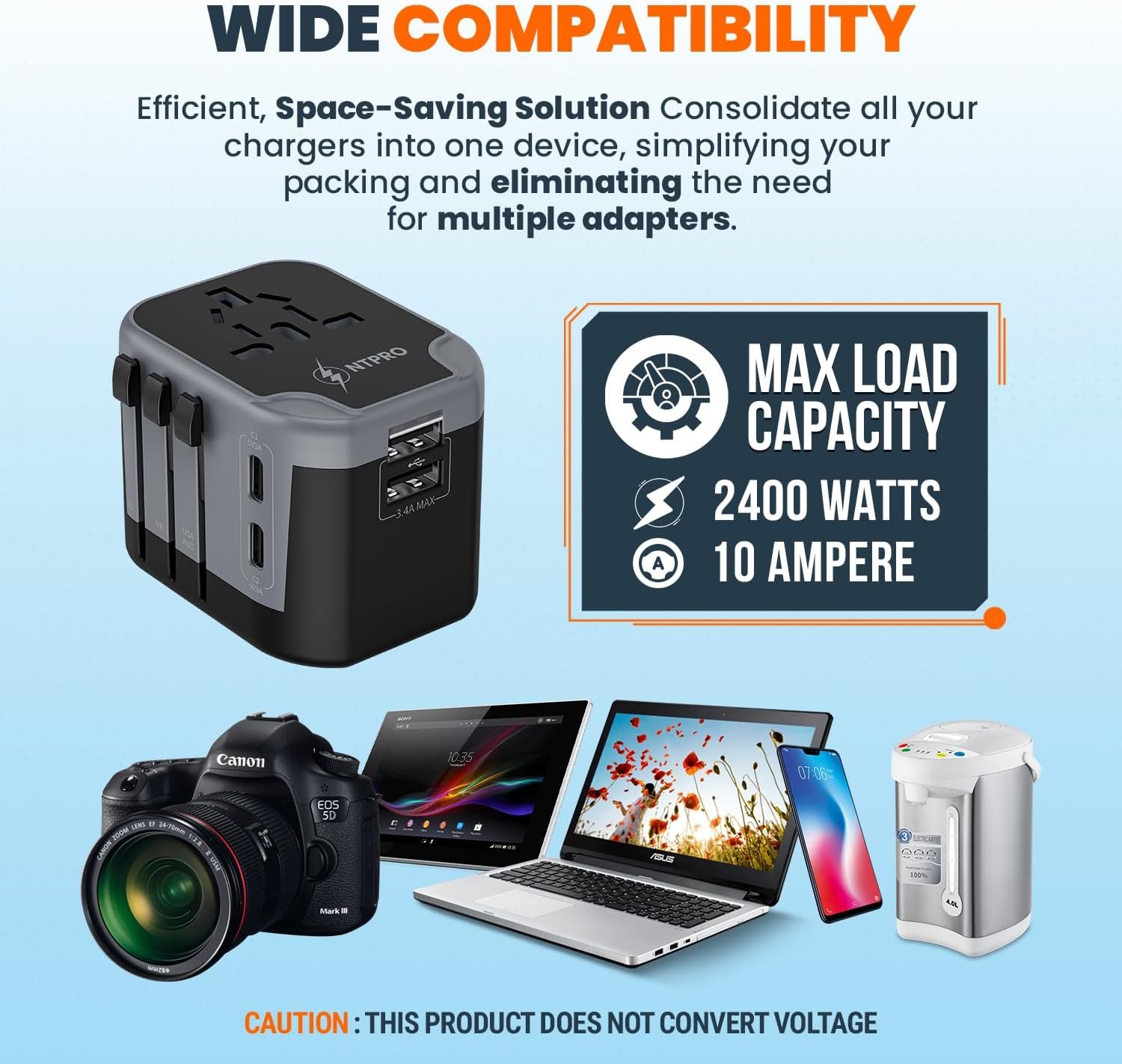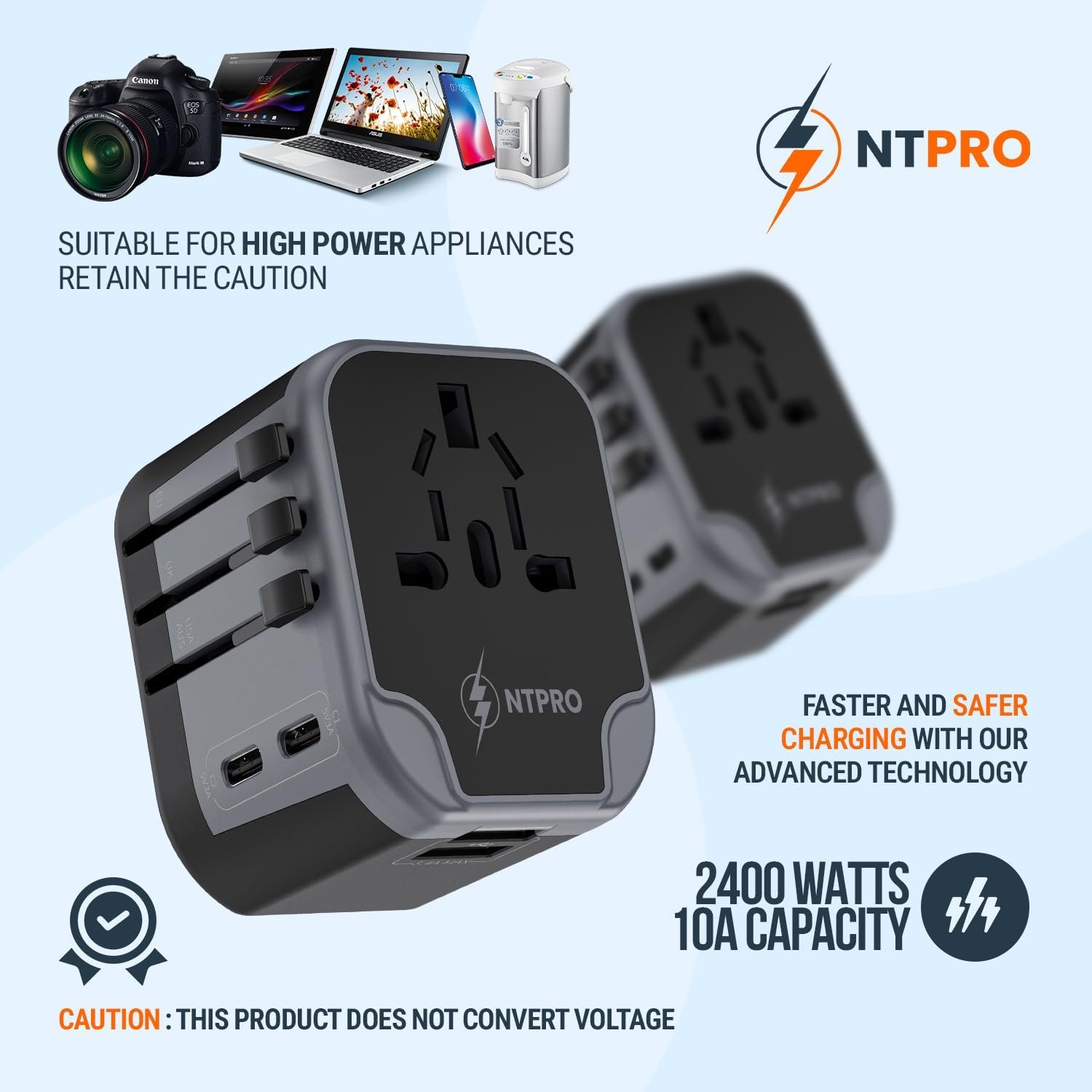 Seamless Power: Our 5-in-1 travel adapter supports up to 2400W/10A, ideal for phones, tablets, laptops, cameras, etc. It features 2 USB C, 2 USB A ports, and AC power adapter, which enables charging of 5 devices. Keep total power under 2400W for safe use.