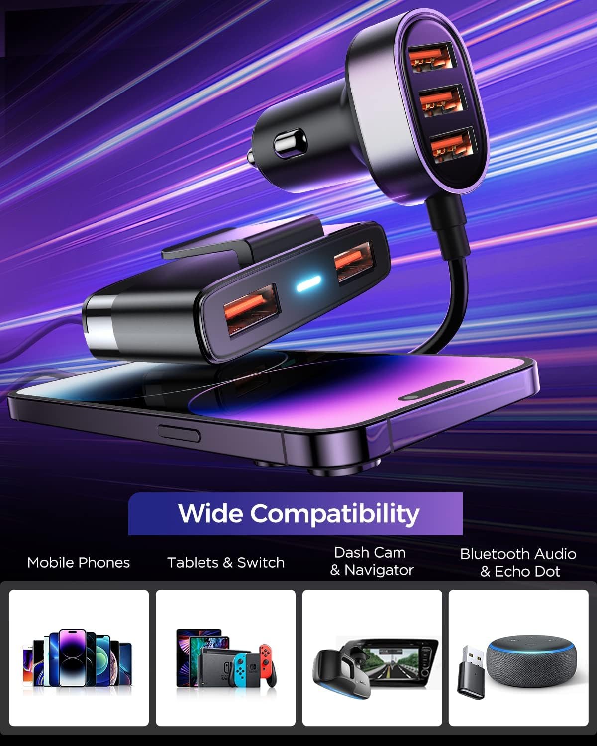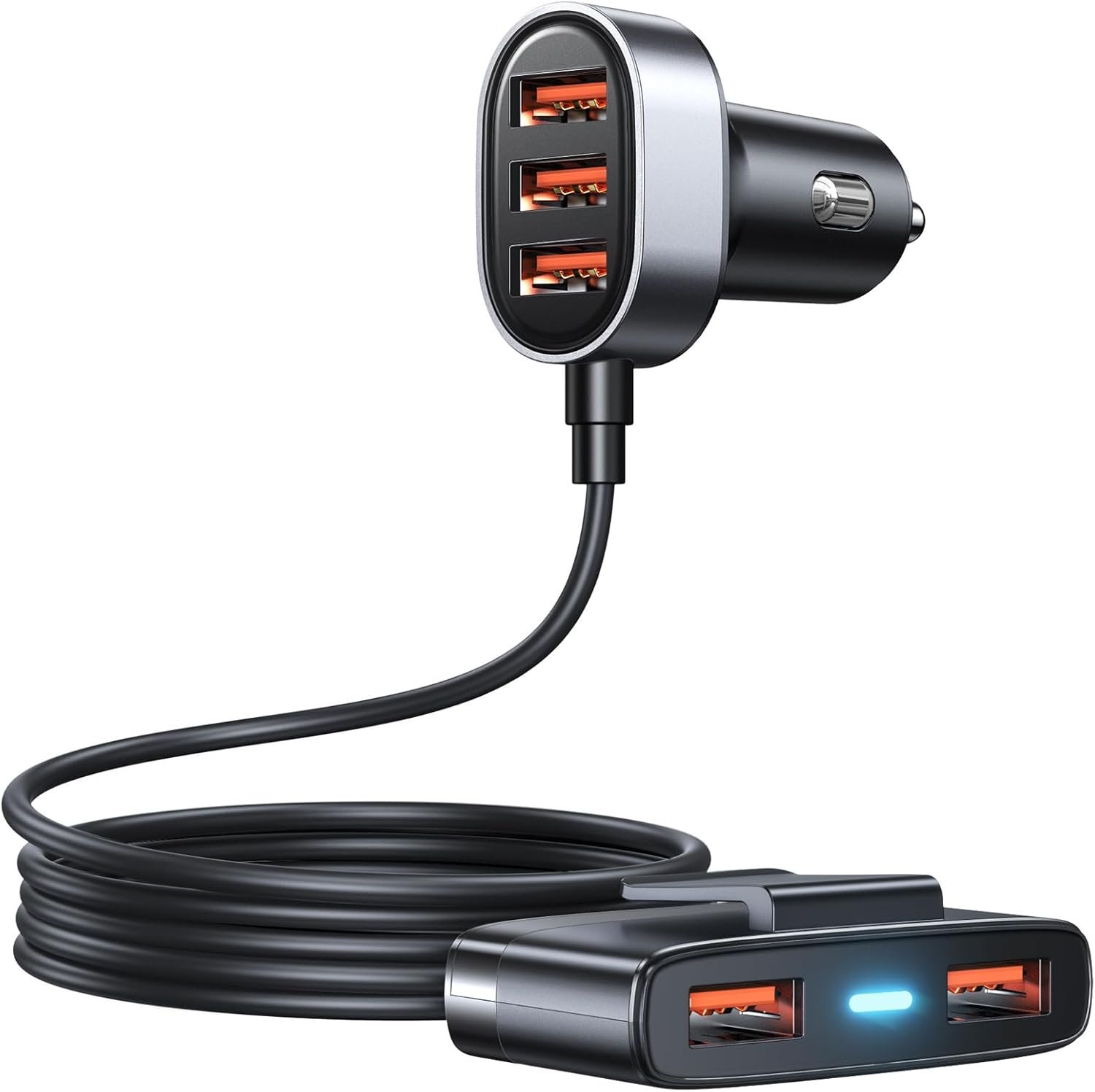 5-in-1 USB Car Charger Multi Port, 12V Phone Adapter for Multiple Devices, Cigarette Lighter With 5FT Extension Cable for Back Seat Charging