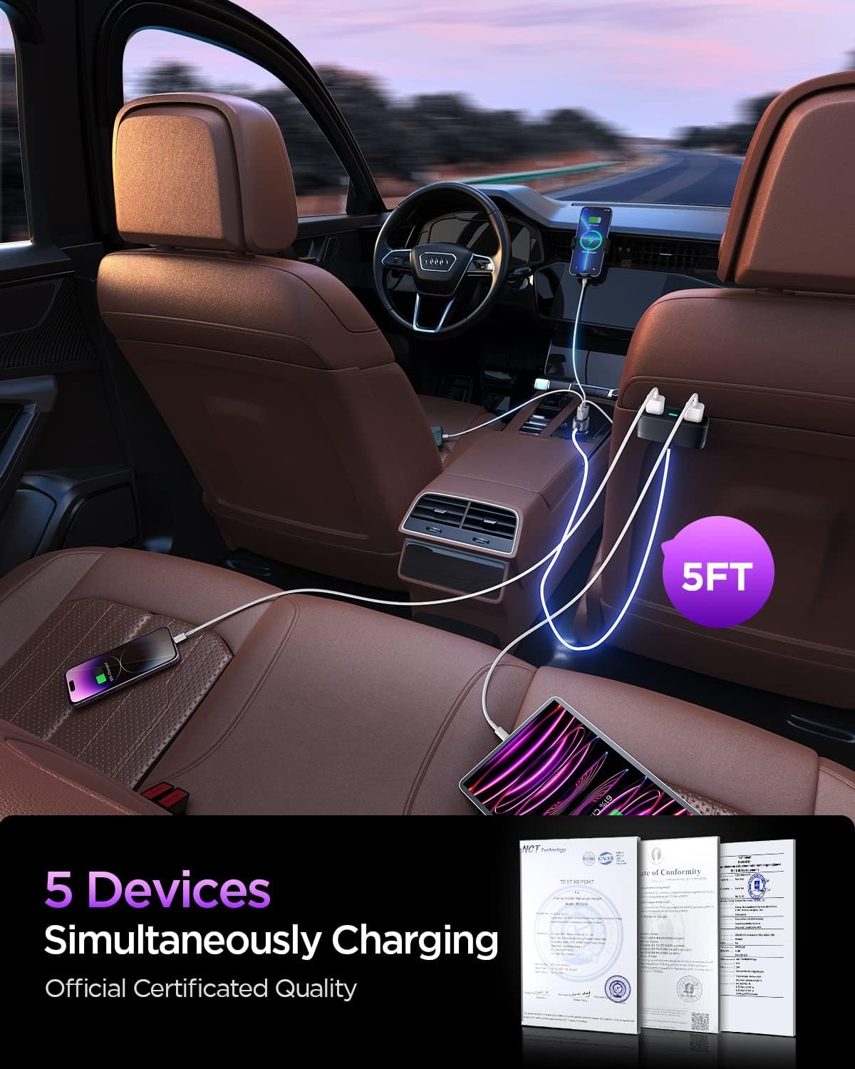 🎁Traveling & Family Car Charger: Tollefe 5 multi-port car charger designed for multi-charging needs USB port for car. 3 cigarette lighter USB for driver seat passengers, 2 car charging ports for rear seat passengers. The 5 FT durable extension cable design, allows all passengers could charge their electronic devices simultaneously. Get one for your upcoming family trip or give it as a decent gift for someone you care about.