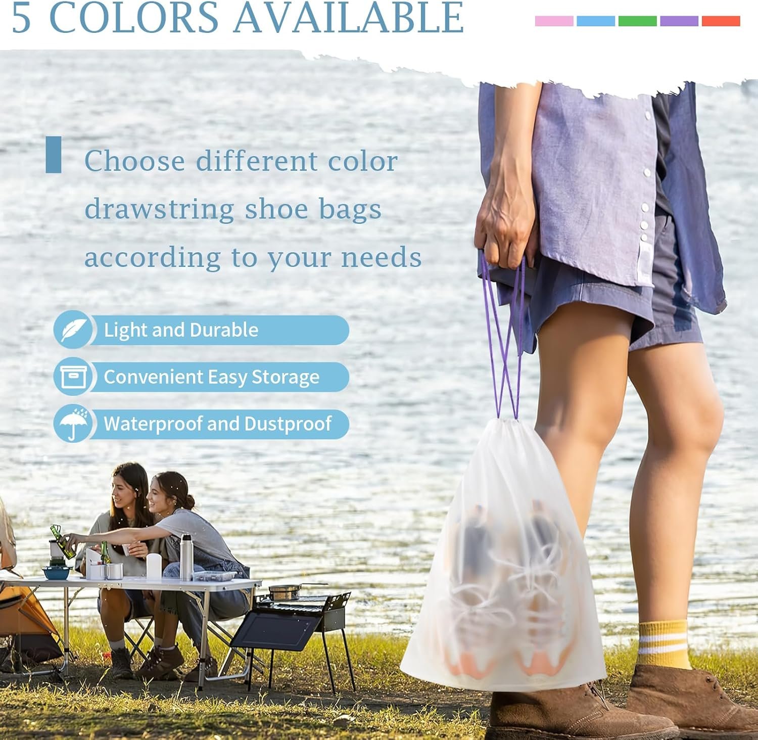 Upgrage Craftsmanship! Premium Material: Our travel shoe bag is made of reusable waterproof PE material. The travel shoe bags are not easy to break, avoiding travel worries. Convenient colorful drawstring design for easy hanging and quick organization