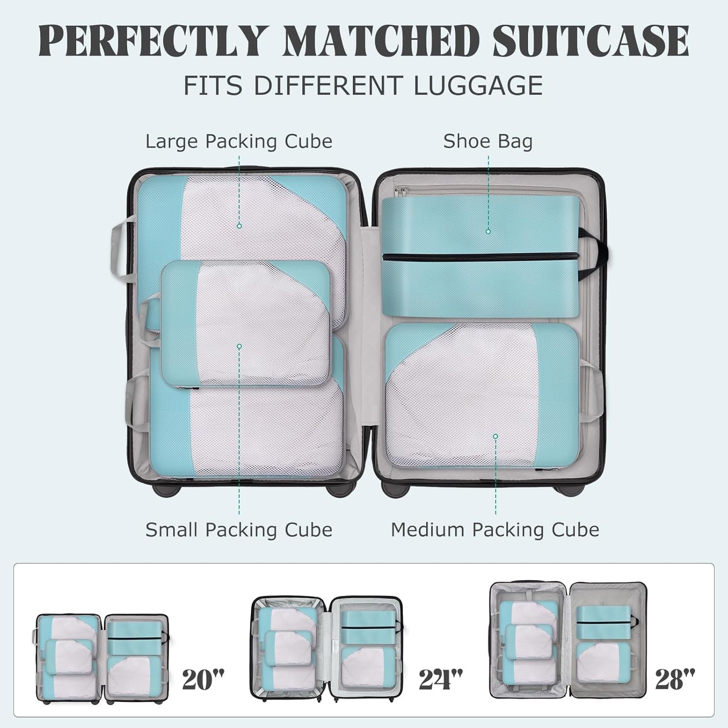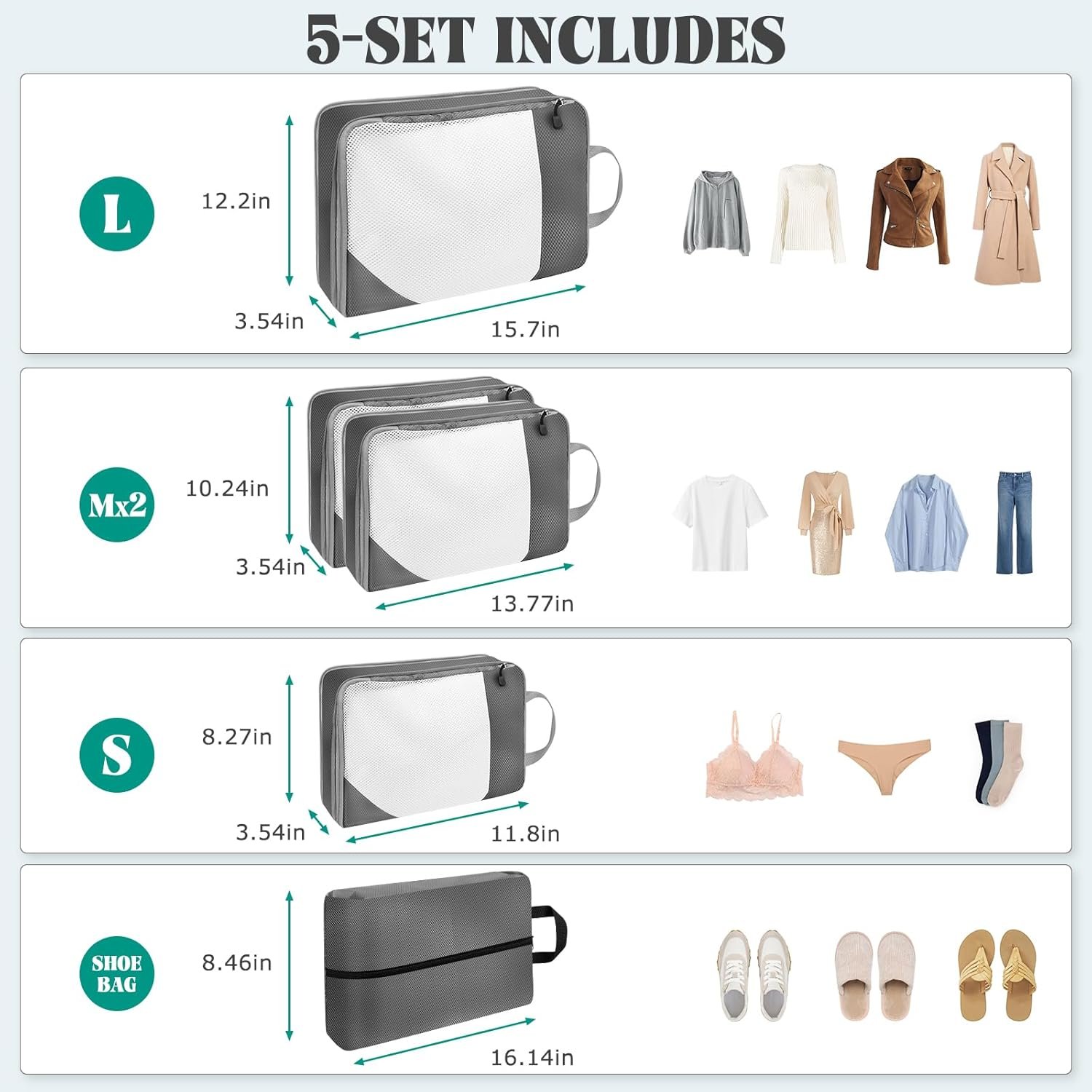 5 SET INCLUDES: The set of packing cubes includes one large size, two medium size, one small size and one shoe bag(shoes not included). Different Sizes Packing Cubes for Different Packing Purposes, large size can use to hold Jackets and Sweaters, medium use to hold shirt or other garment, small use to hold underwear or socks. There are four colors for you to choose. It’s also great as a gifts for travelers.