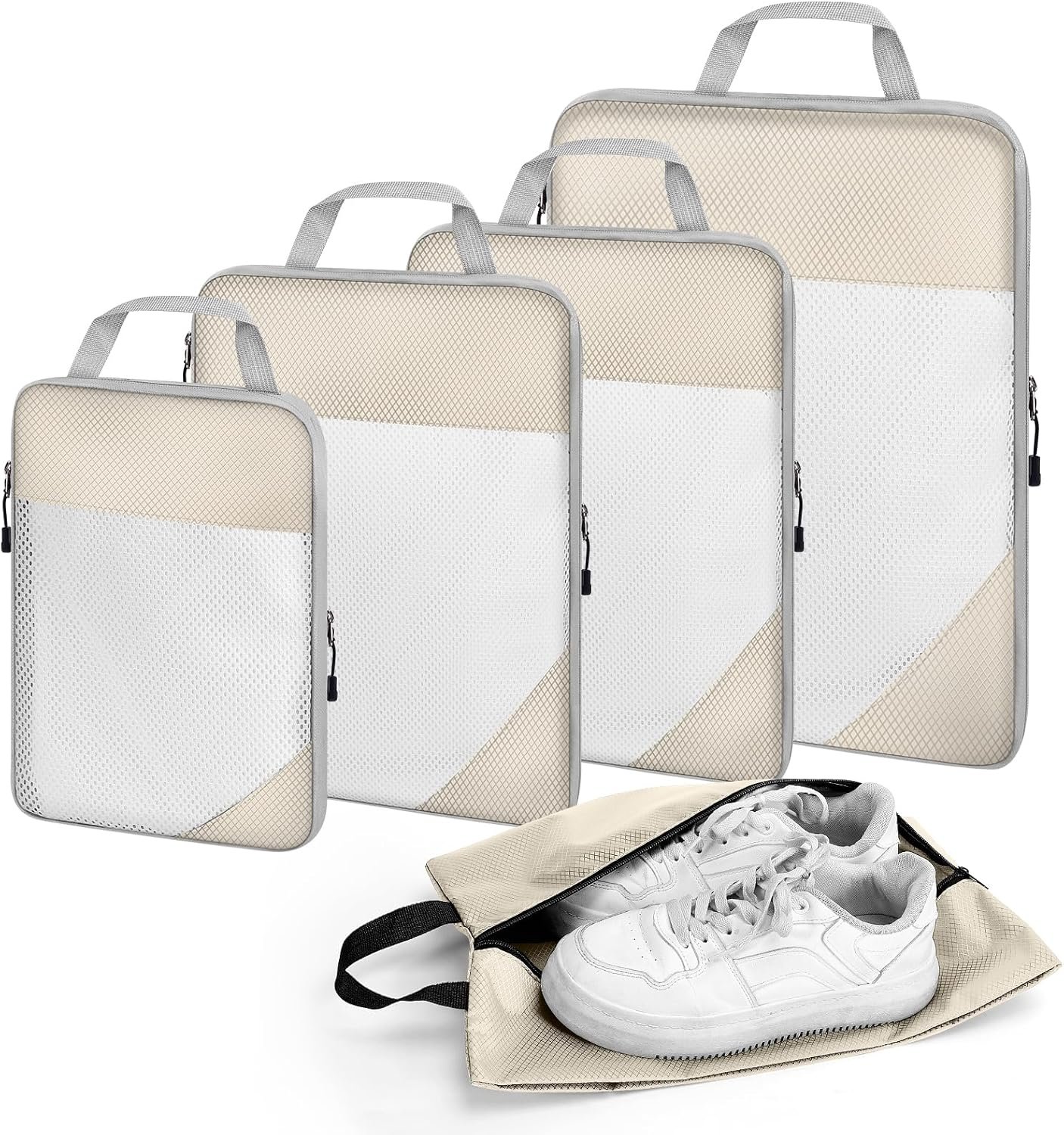 5 Set Compression Packing Cubes Travel: Suitcase Organizers Bags for Compression Luggage Organizer Bags for Traveling Packing Organizers for Travel Essentials Accessories, Beige