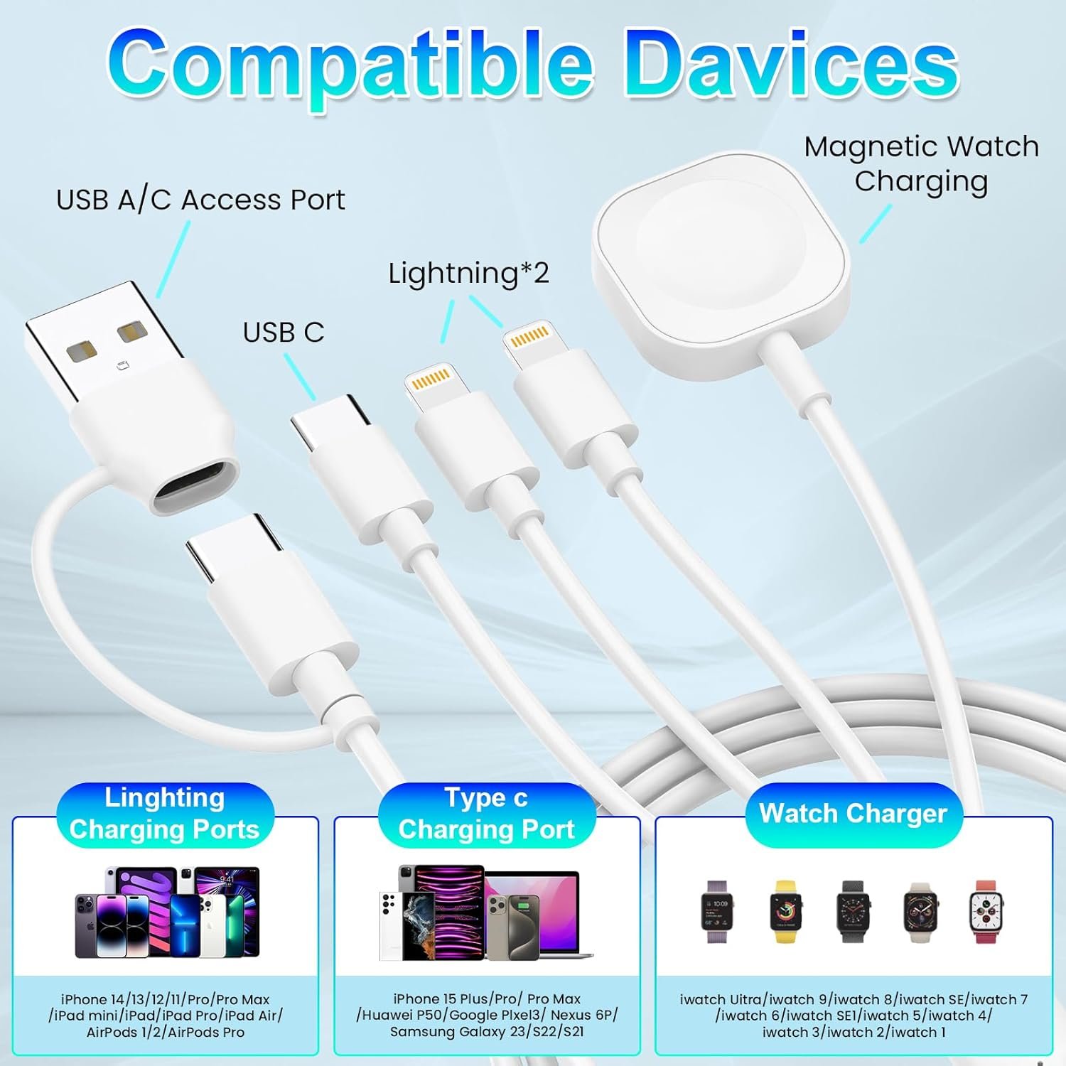 6 in 1 Multi Charging Cable:The watch charger multi charger cable has 2 input ports and 4 output ports, including 2*Lighting/USB C/iWatch charger. Easily charge four devices simultaneously, making it an ideal backup charging cable for travel