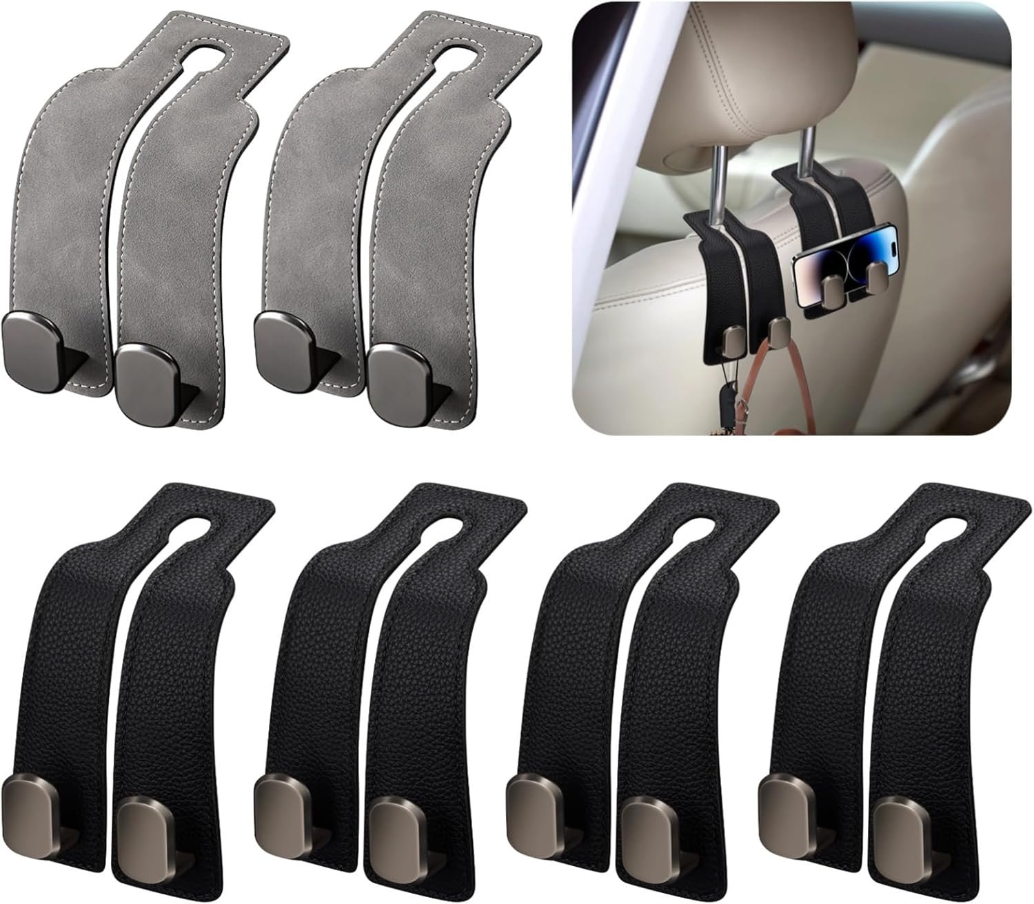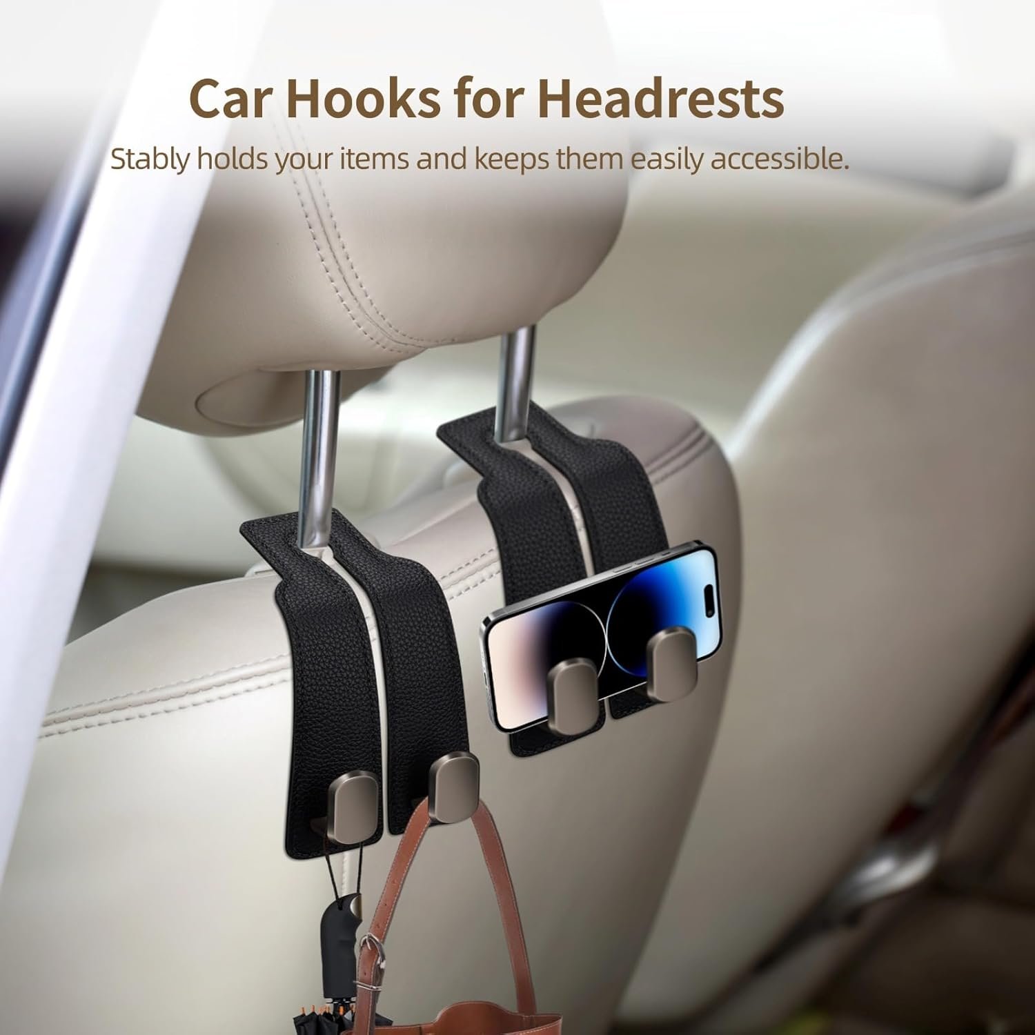 Convenient Double-hook Set: Includes 6 car hooks for headrests; fits three seats simultaneously; Adopts a stable double hook design to expand storage space and enhance stability; securely holds various items without tipping