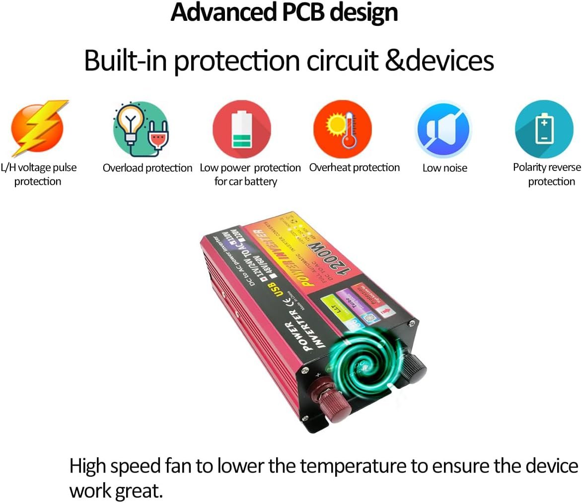 Safety Features: Built-in overload, short circuit, and overheating protection safeguards your devices and the inverter itself. With built-in fan to to dissipate heat quickly.