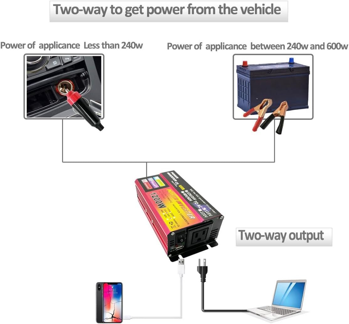 This car power inverter is an essential accessory for powering your devices on the go. When you are travelling in a van or a caravan, it doesn’t mean that you have to stay away from electronics completely. Many times you may need power for your cellphone, campvan fridge, entertainment devices, etc. With a robust 1200watts peak instantaneous output/600W continous output, it effortlessly converts your vehicle’s DC power 12V/24V into reliable AC power110V, allowing you to charge laptops, run small appliances, and more. Its sleek red aluminum casing ensures durability, while the compact design makes it easy to store when not in use. The included battery cables with heavy-duty clamps provide a secure connection to your car’s battery. Stay powered up during road trips or outdoor adventures with this convenient and powerful car power inverter.