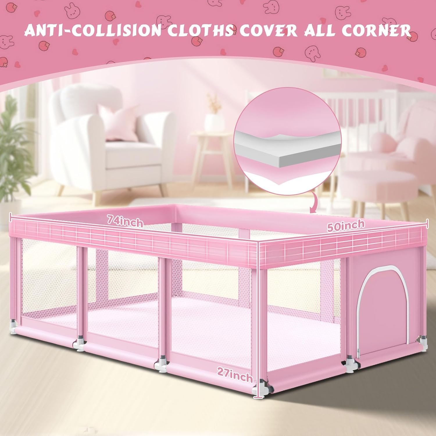 74″ ×50″ Large Baby Playpen, Baby Playard for Babies and Toddlers, Play Pens for Indoor & Outdoor, Sturdy Safety Play Yard with Soft Breathable Mesh, Anti-Fall, Pink