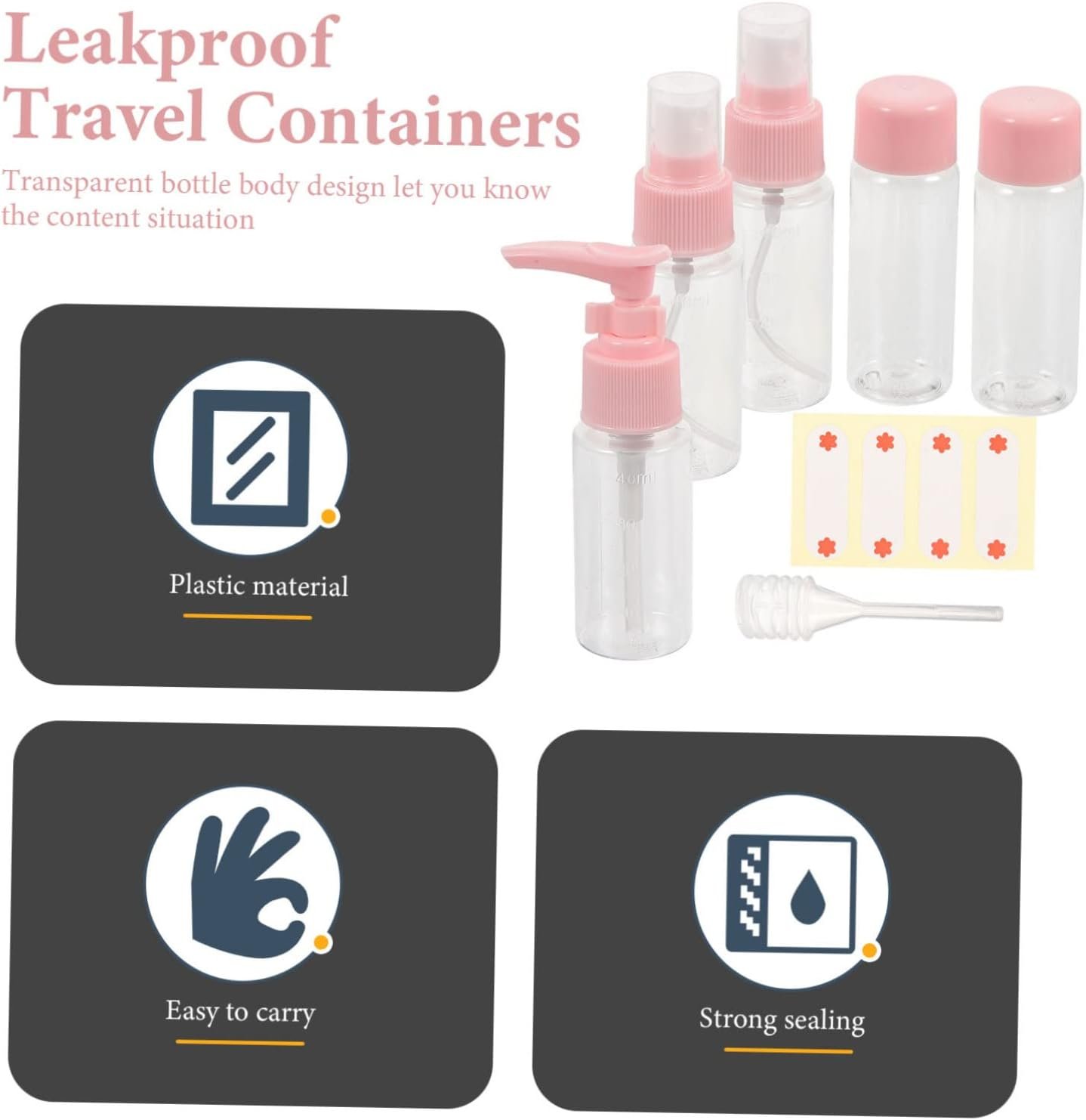 Refillable Travel Bottles This set contains two facial cream bottles, two larger bottles, a dropper, a sprayer, a and an outer bag.Toiletry Bottles Professional designed for those who participate in outdoor activities and travel frequently, features leakproof, easy to fill, squeeze, clean and refill.Leakproof Travel Containers A professional choice of travel accessories for women use.Travel Bottles Made of plastic material, practical and useful