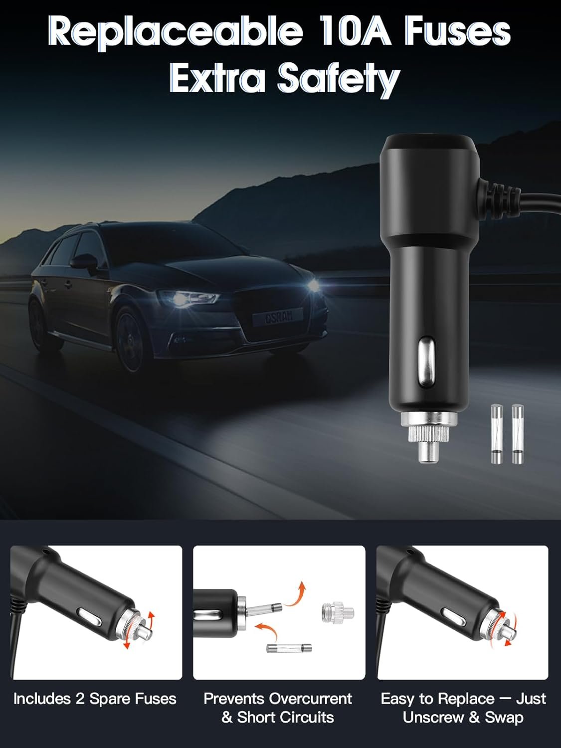 🚗 Universal Compatibility – 12V/24V Vehicles:Compatible with all 12V/24V vehicles, including cars, trucks, SUVs, RVs, and boats. Includes 2 replaceable 10A fuses for added safety. Backed by an 18-month warranty for peace of mind.