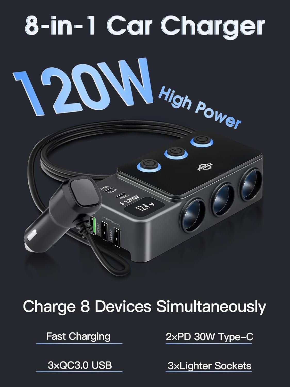 🔌 8-in-1 Car Charger – 120W High Power Output:Features 3 cigarette lighter sockets and 5 USB ports, providing a total 120W output. Supports multiple devices at once, making it ideal for family road trips, truck drivers, and daily commutes.