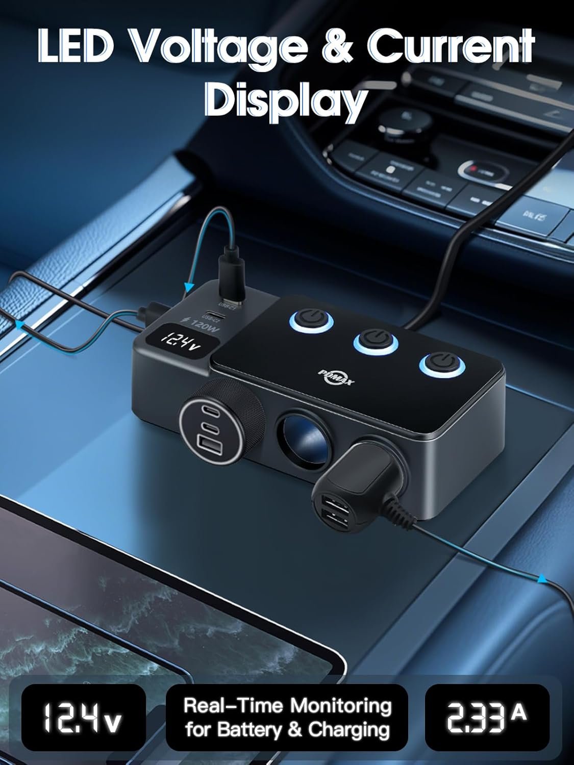 8 in 1 Cigarette Lighter Splitter, 120W Car Charger Adapter with PD 30W Type-C & QC3.0, 3-Socket Car Outlet with 5 USB Ports, LED Voltmeter, Independent Switches, 12V/24V Multi-Port Charger