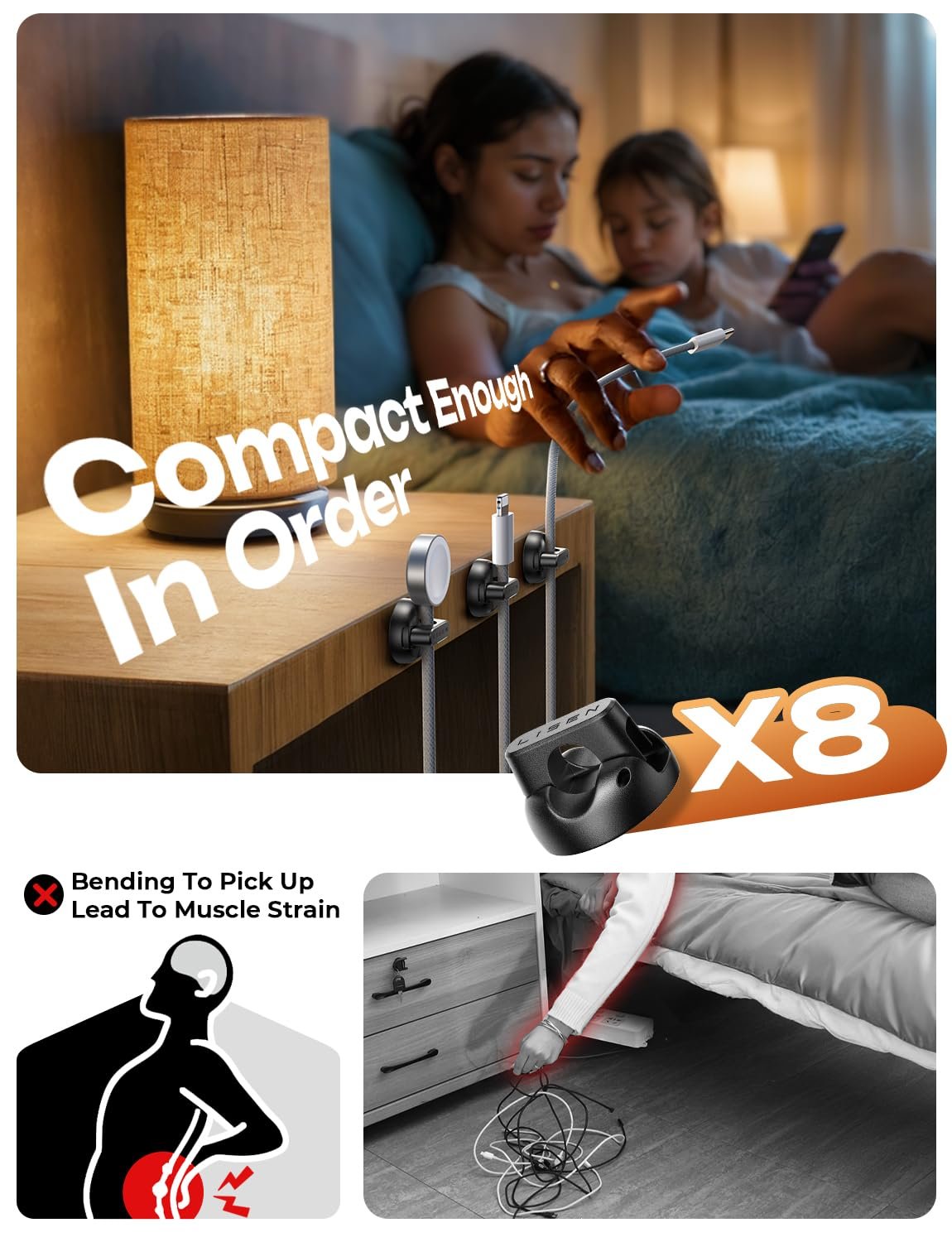 Compact, Tidy Up Any Space: Measuring just 0.85″ x 0.85″ x 0.55″ and weighing only 3g, LISEN cold holder is perfect for narrow spaces. With 8 individual clips included, you can neatly arrange cables on desks, nightstands, walls, or even in your car. This versatile organizer is a must-have accessory for keeping your space clean and clutter-free