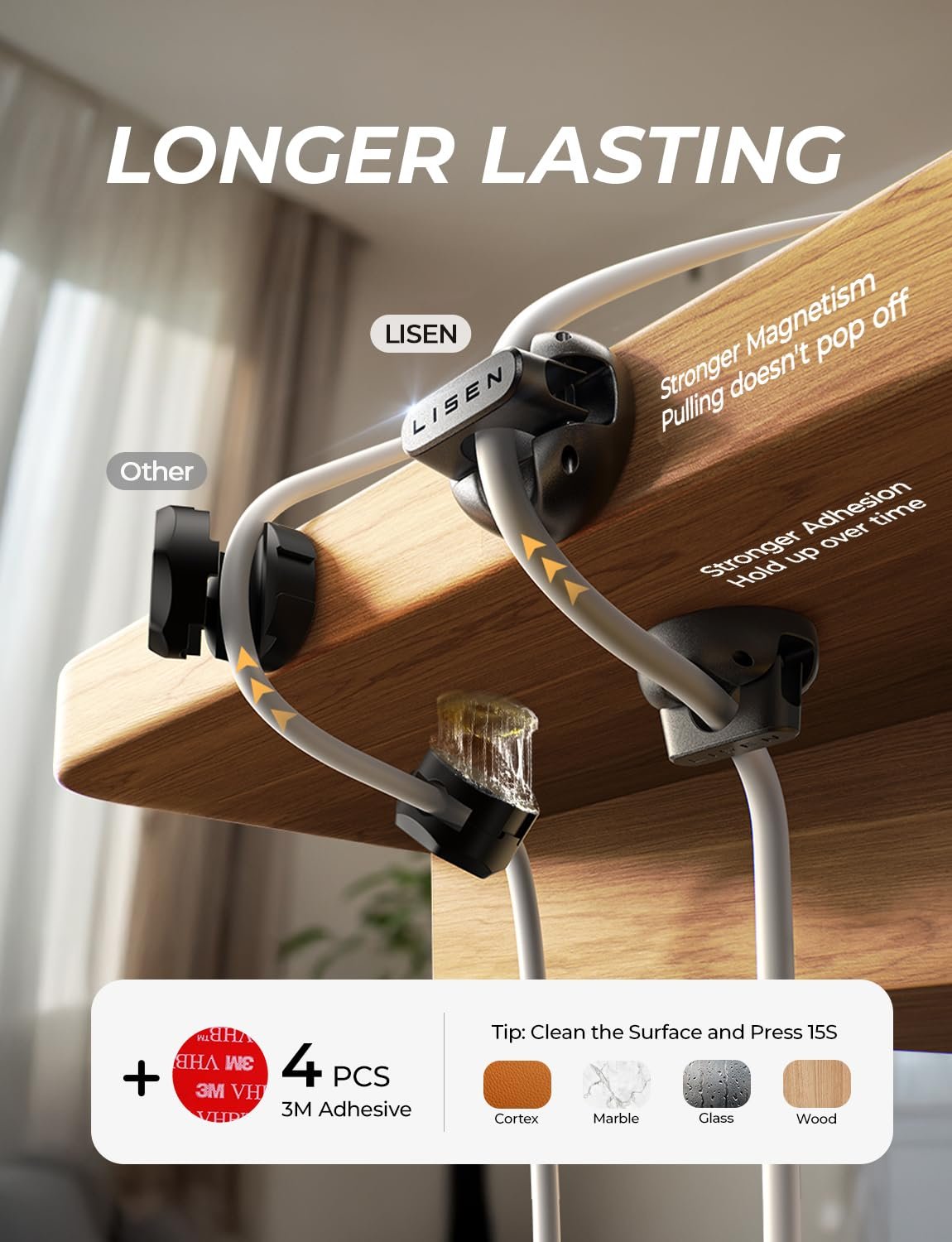 No-Residue, High-Strength Adhesive: LISEN cord organizer for desk uses premium acrylic adhesive, stronger than 3M tape and leaves no residue. With 4 extra adhesive pads, magnetic clips has strong adhesion and flexible installation. Wire organizers for cords can firmly stick to smooth and dry surfaces like wood, glass and ceramic tiles. The transparent pads won’t damage furniture, suitable for home and office. Easily manage and tidy up cords, improving space neatness and functionality