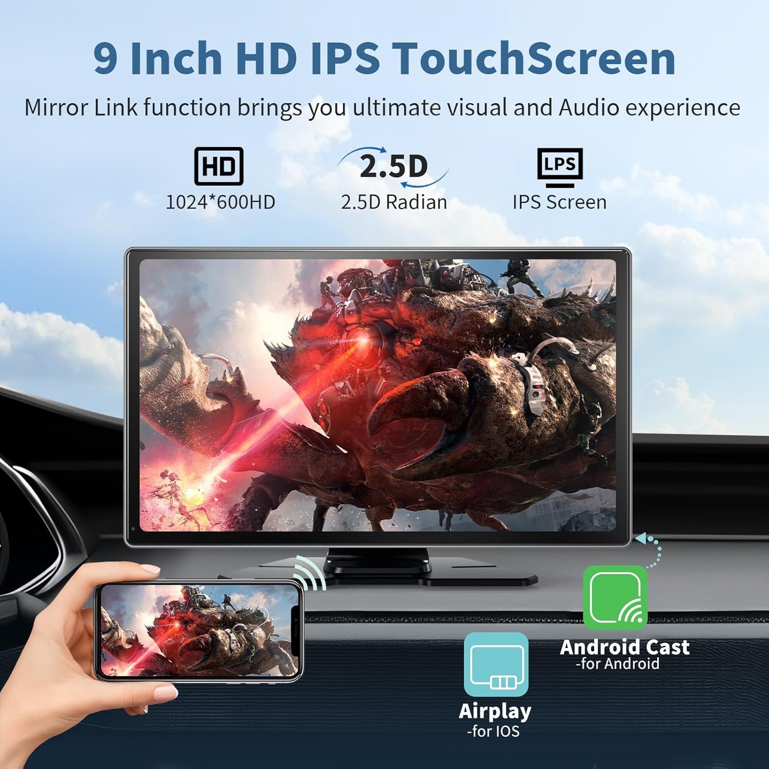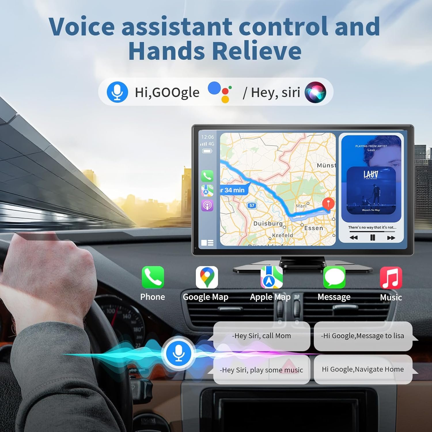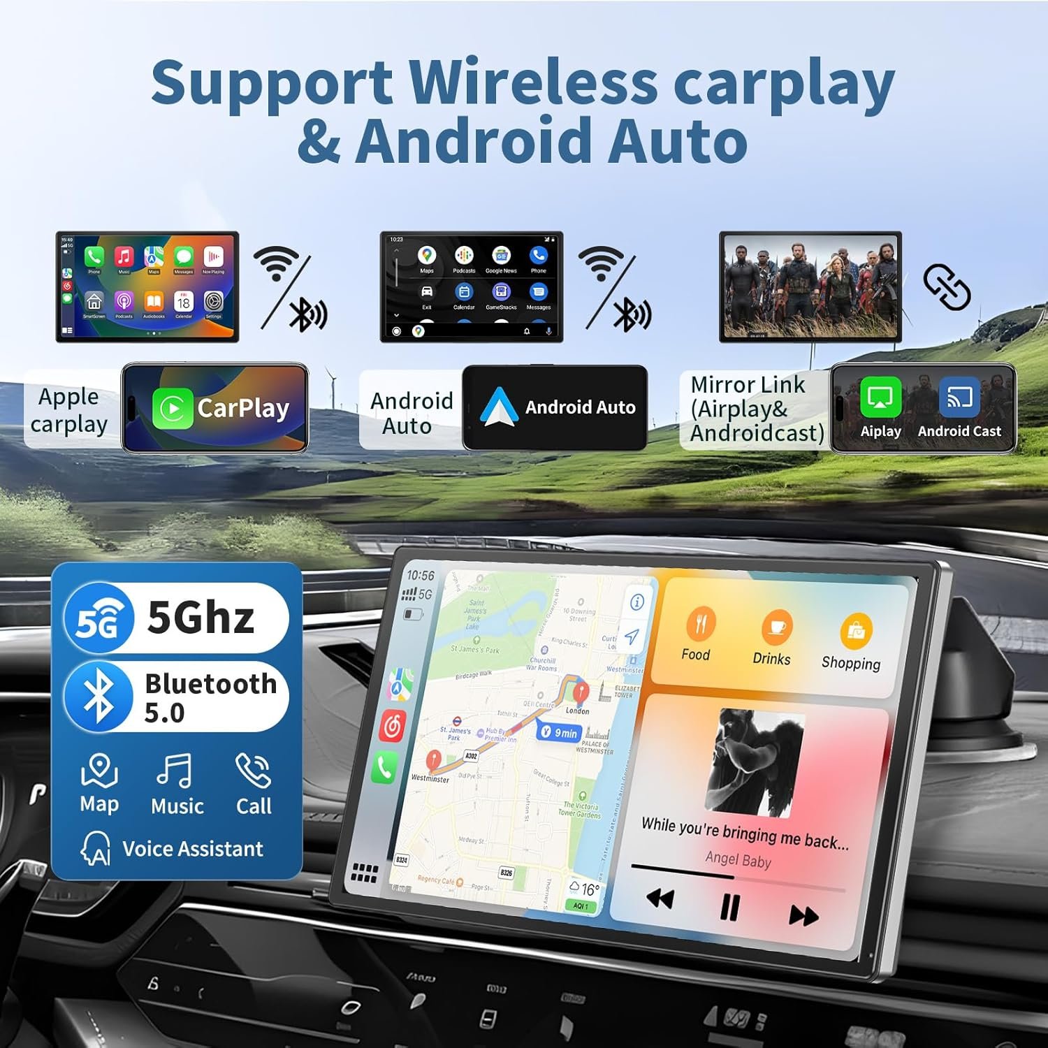 【Wireless Carplay & Android Auto】The 9 inch HD Portable carplay Screen for car supports wireless Carplay and Android Auto. Simply connect to your smartphone via Bluetooth, WiFi, or USB to access your phone’s music, map navigation, hands-free calling, messaging, and more. By controlling Google Assistant or Siri through voice commands, you can provide a safer and more convenient driving experience for the wireless car touchscreen.