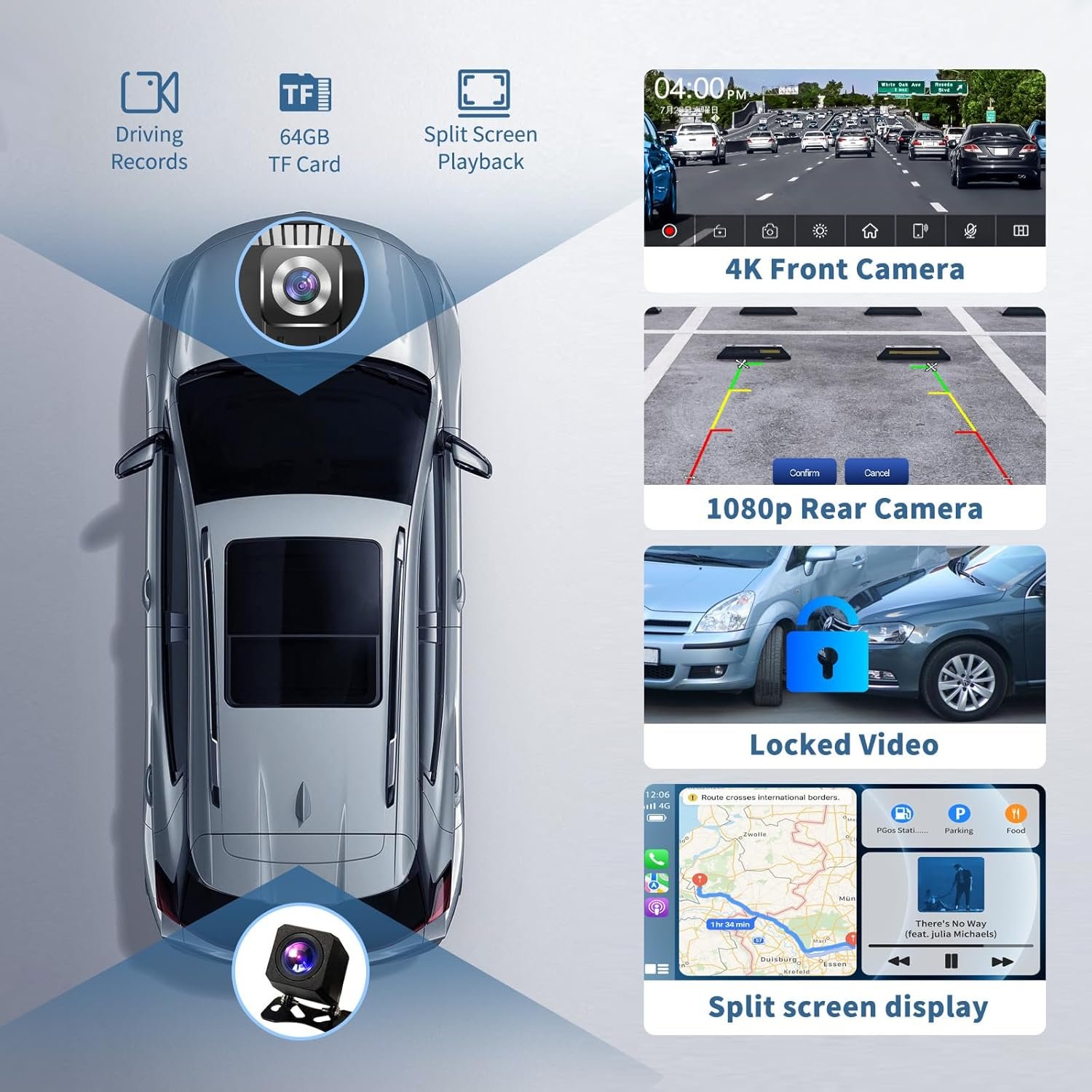 【Loop Recording】The wireless car screen supports loop recording, ensuring continuous capture of new footage. With a huge 64GB of storage space, guaranteeing that no crucial moments are missed.