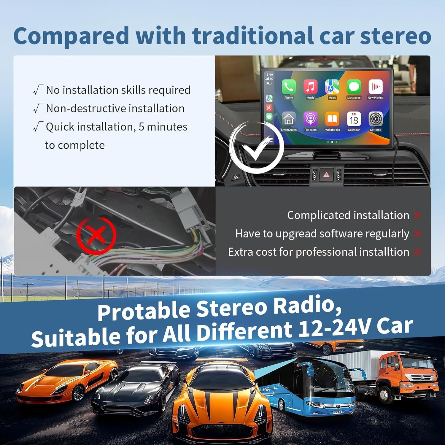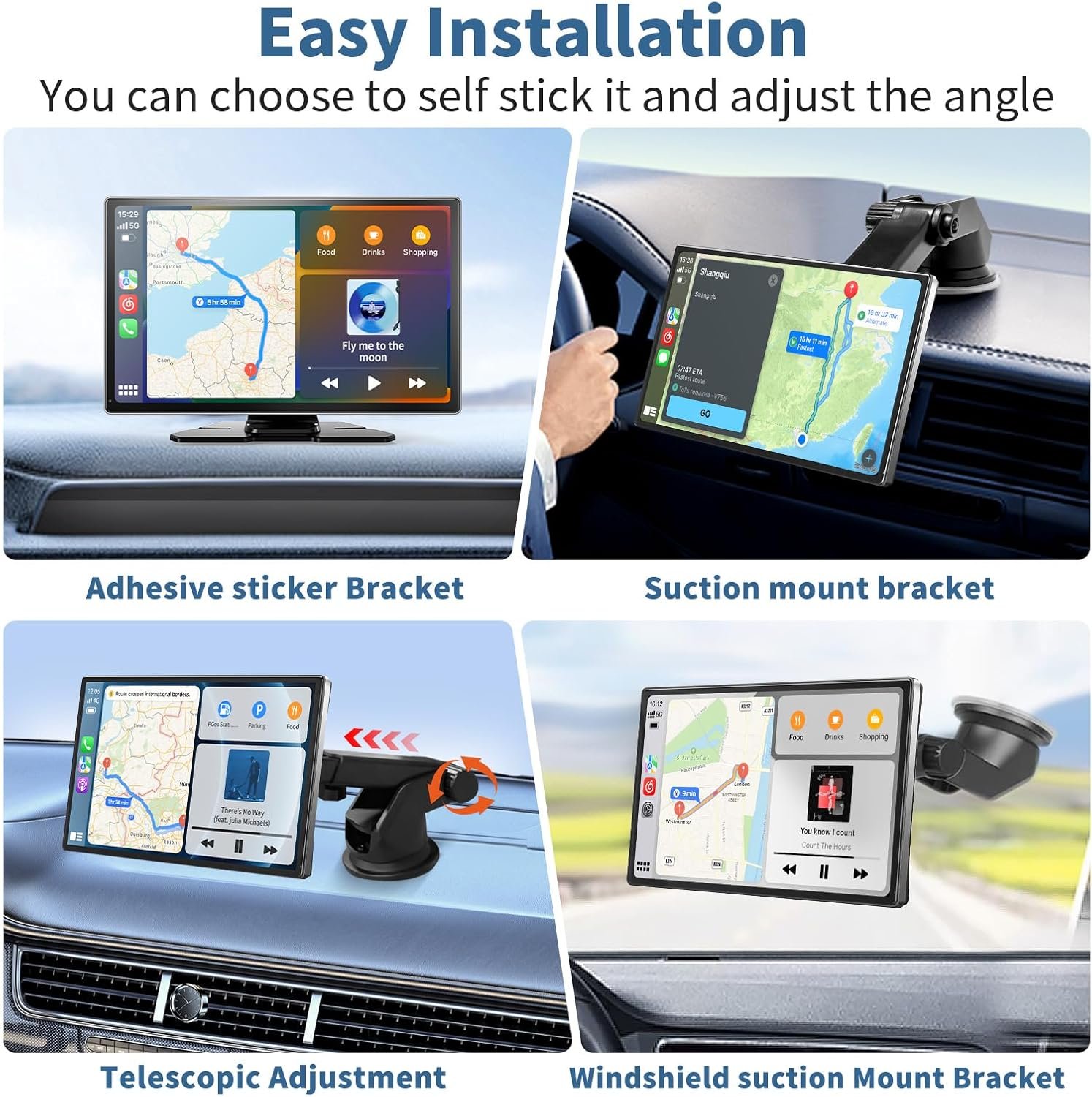 【Easy to Install and Widely Applicable】This portable wireless CarPlay display supports all vehicles with 12V~24V voltage, such as campers, RVs, trucks, pickups, and vans. No need to disassemble the car console and keep the original radio intact. Two kinds of ways to install it : a 180-degree adjustable adhesive mount and a 360-degree rotating suction mount, it also easily secures to your dashboard or windshield.