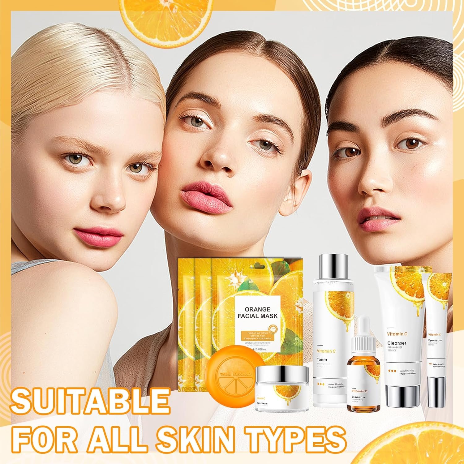 Vitamin C Facial Skincare Kit: Skin care kit contains cleanser, toner, eye cream, face cream, essence, soap and facial mask, which are all skin care products you need daily. The combination and pairing of Skincare set are very comprehensive, designed specifically for daily skin care, allowing you to easily and quickly complete all skincare processes.