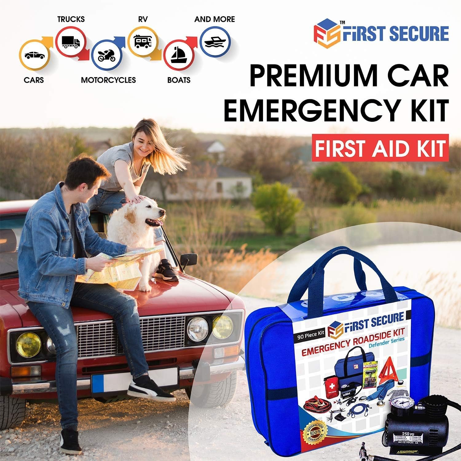 Roadside Assurance: This comprehensive kit includes a 90-piece premium roadside set coupled with a 48-piece first aid kit, offering unparalleled support in emergencies. The all-weather, heavy-duty tools and supplies, including a reflective warning triangle, jumper cables, air compressor, and more, are specifically designed to provide security and assistance in any roadside emergency, ensuring you’re fully equipped to handle unexpected situations with confidence.