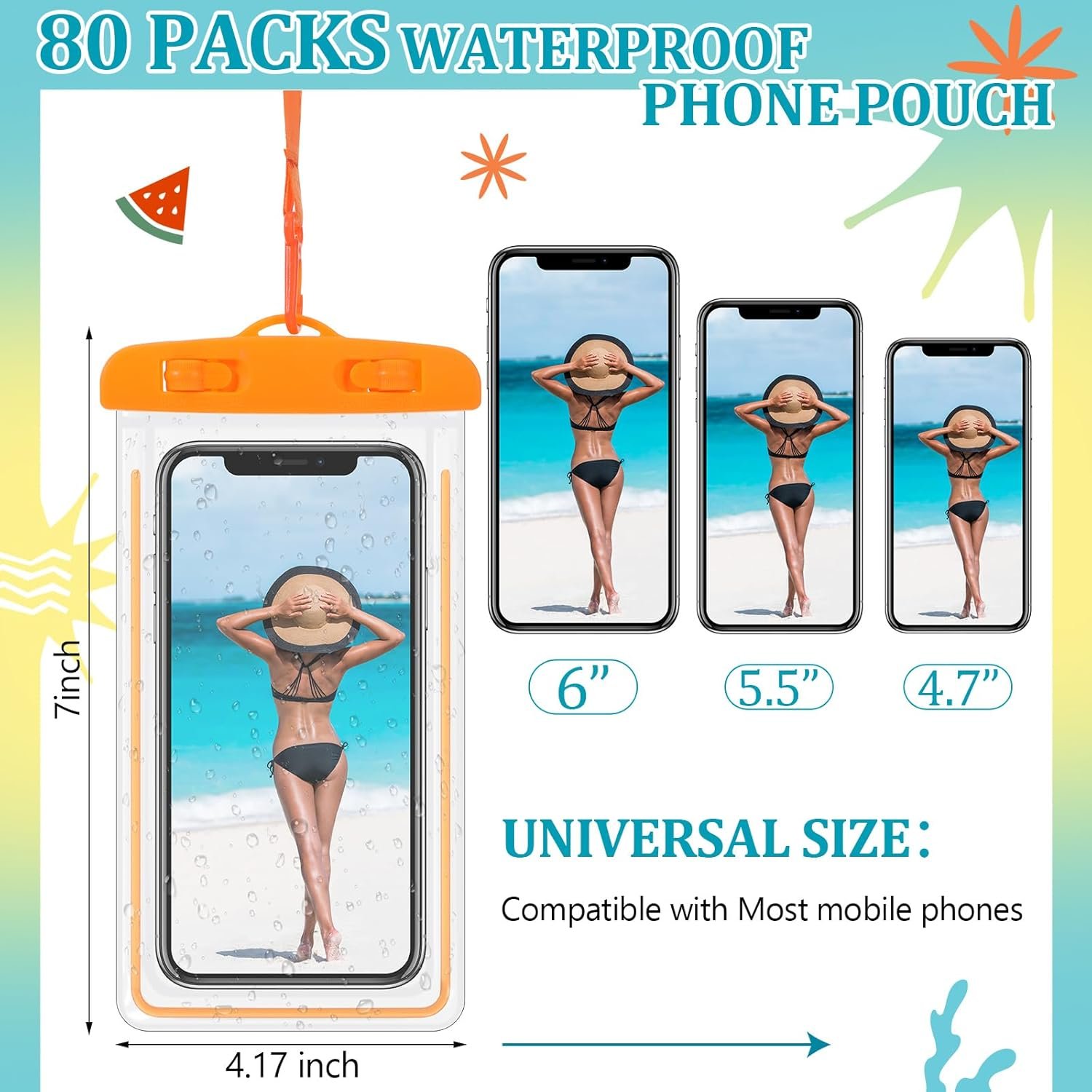 Sufficient Quantity, Widely Available: the package contains 80 waterproof phone cases in 10 colors, enough to meet personal or corporate needs, suitable for various activities such as family adventures, business activities or sports competitions; The waterproof mobile phone bag comes with a black adjustable and detachable lanyard, and the head rotation design can prevent the lanyard from being entangled