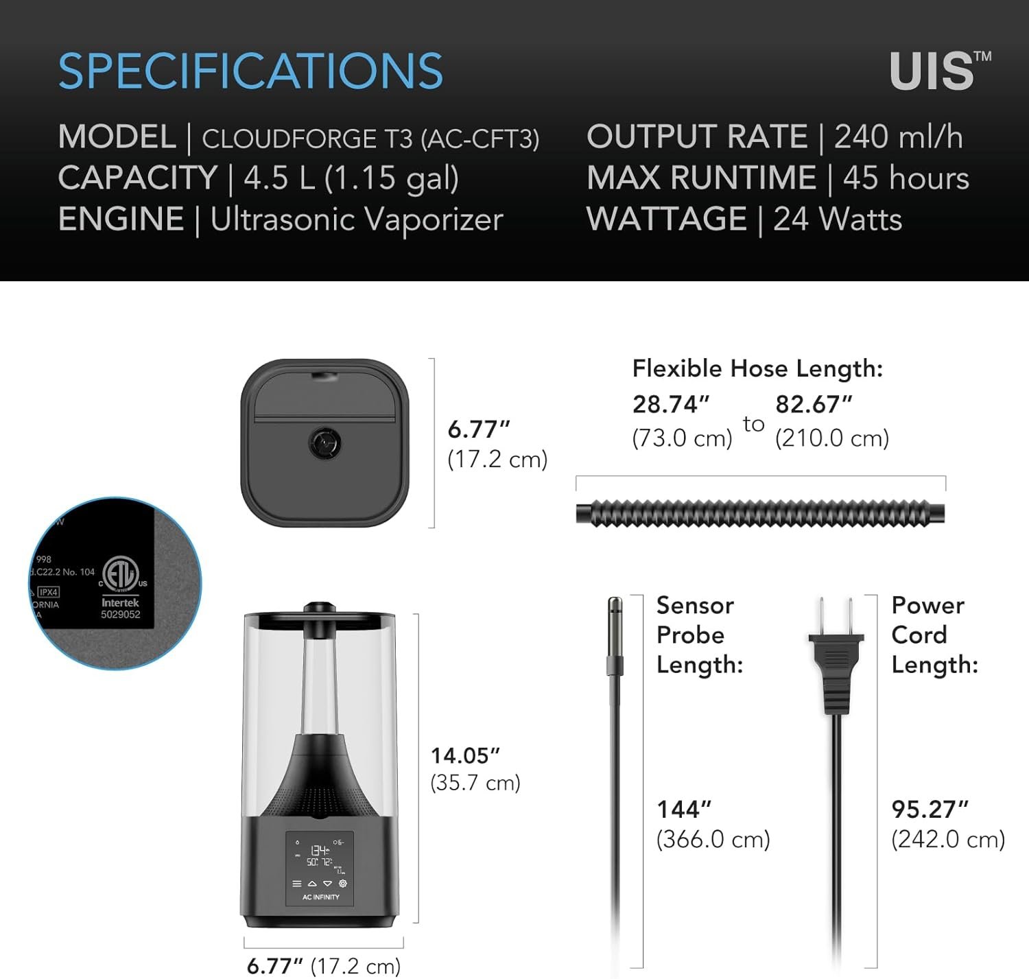 Model AC-CFT3 Capacity 4.5 L (1.15 gal) Output Rate 240 ml/h Wattage 24 Watts Included Tubing Flexible Hose Engine Ultrasonic Vaporizer Trigger Programming VPD & Humidity