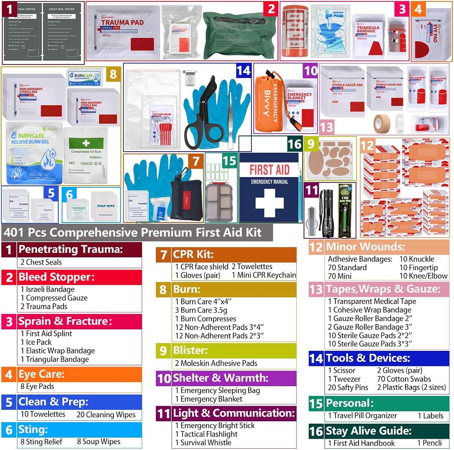 Advanced Comprehensive First Aid Kit with Well Organized Labelled Compartments Removable MOLLE System First Aid Trauma Kits for Car, Home,Camping, Office and etc.-401 Piece