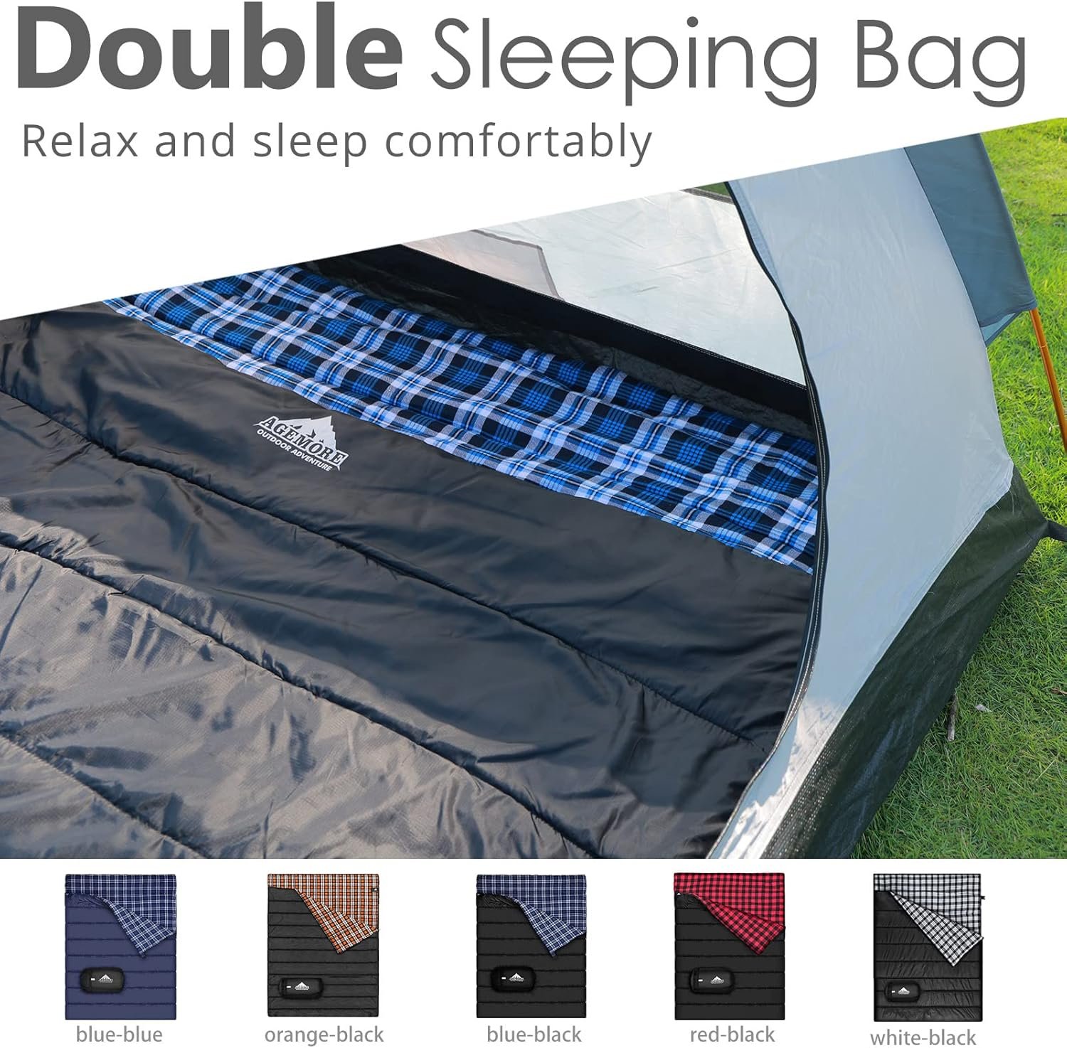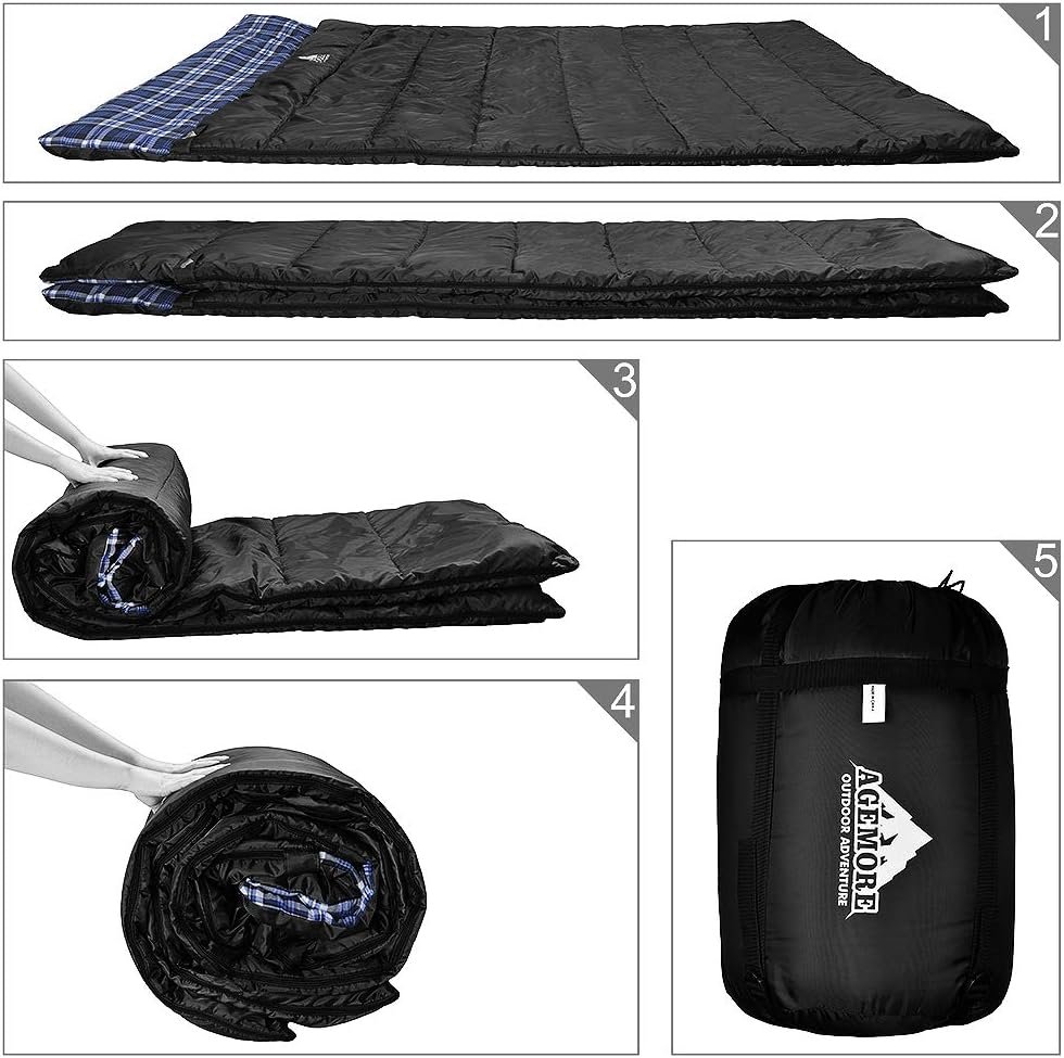 AGEMORE Cotton Flannel Double Sleeping Bag for Camping, Backpacking Or Hiking. Queen Size 2 Person Waterproof Sleeping Bag for Adults Or Teens. Lightweight with Compression Sack
