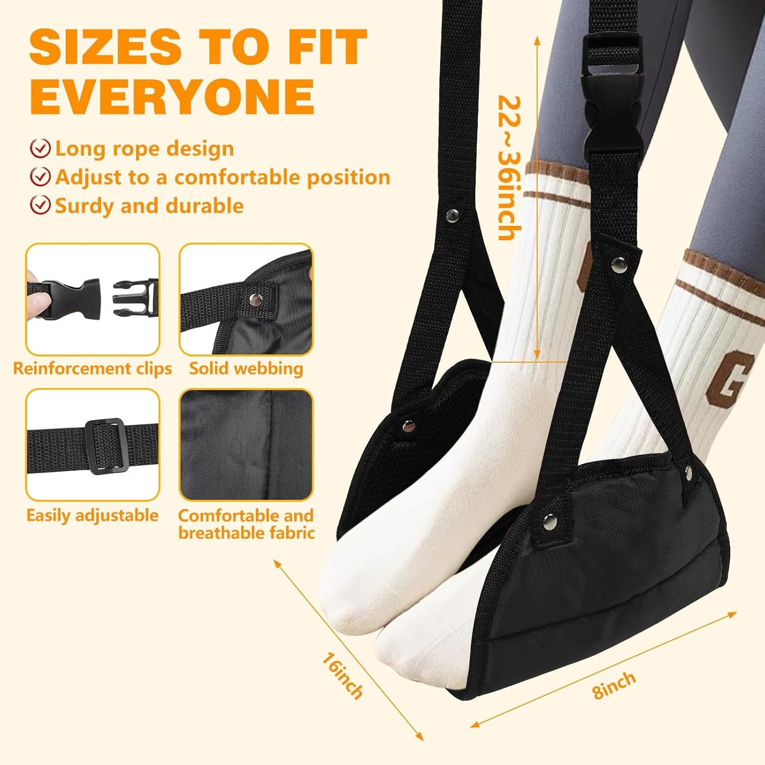 【Perfect for Everyone】Whether you’re tall and have trouble keeping your feet off the floor or short and feel the strain of gravity on your legs, this footrest is designed to help everyone sit more comfortably. Invest in your comfort today with our foot hammock for plane travel.