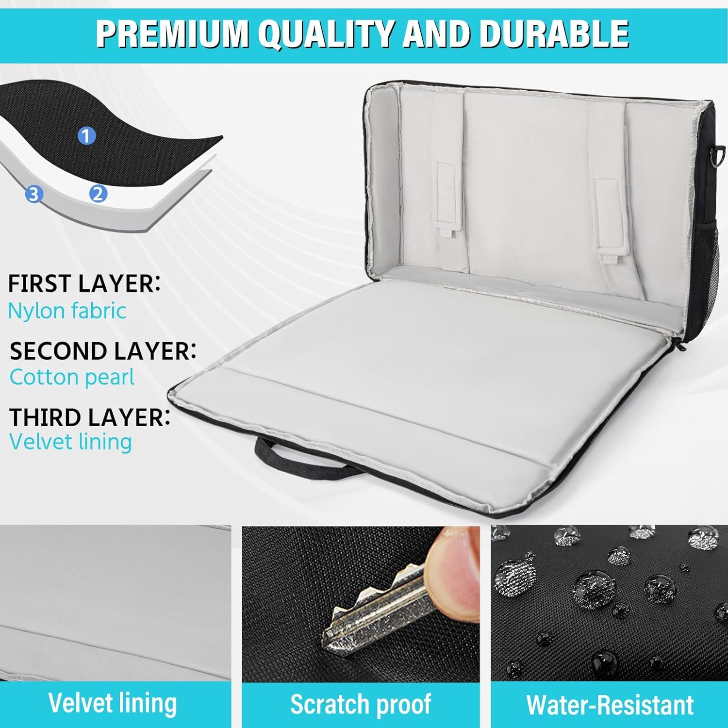 【Professional Designed】Created by professional designers, the inner is soft velvet lining, interior padding and foam(thick 10mm) block cradle for perfect protect your screens from scratches and bumps all around. A transparent label pocket on the back can help you distinguish bag quickly