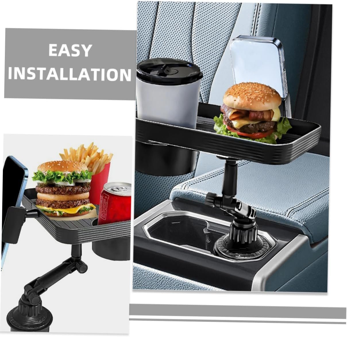 -Compatible with various car models, ensuring universal usage and much convenience auto food tray with phone stand.