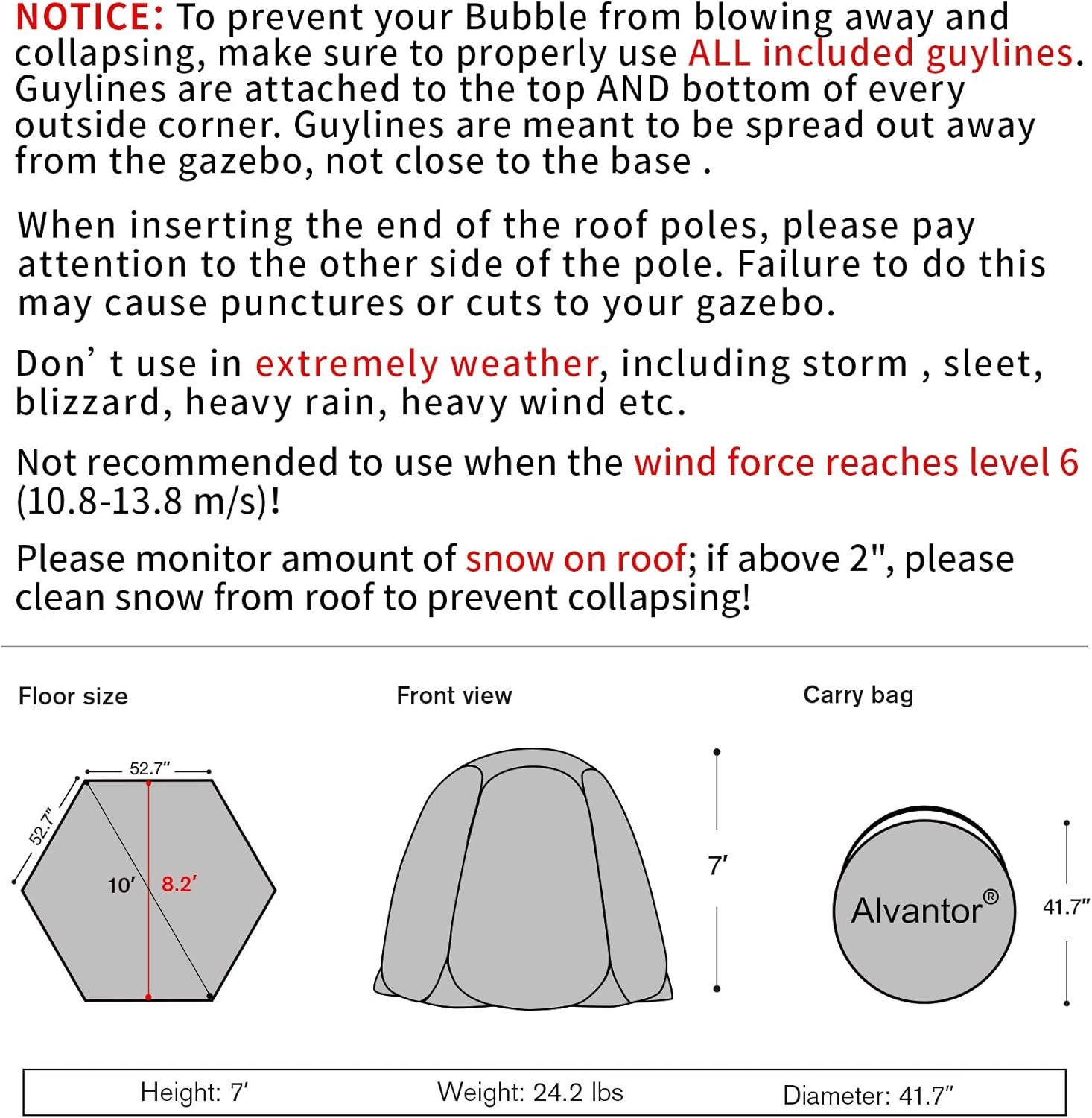 SPACIOUS AND WARM: Alvantor big bubble gazebo provides a spacious interior shelter that comfortably fits between two and three adults. Enough room to place various pieces of furniture so you can give your bubble tent a homely feeling. The four, transparent PVC windows provide 360° view of your surroundings, whilst the inside of your bubble tent stays warm thanks to the excellent heat retention.
