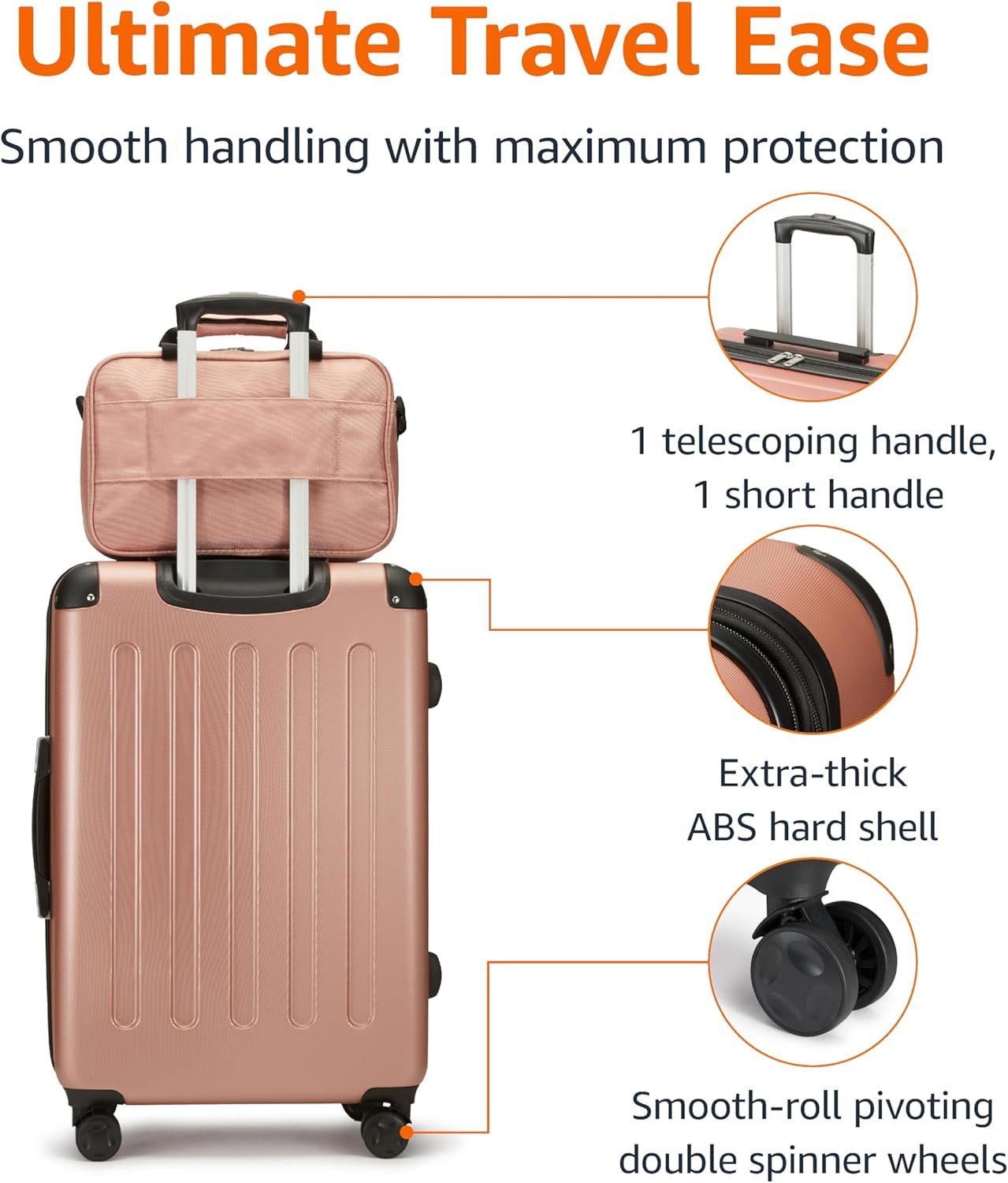 Amazon Basics 3-Piece Luggage Set, Including One Carry On Luggage (22″ Expandable Hardside Suitcase With 8 Spinner Wheels), One 15-Inch Tote Bag and One 10-Inch Compact Travel Bag, Rose Gold