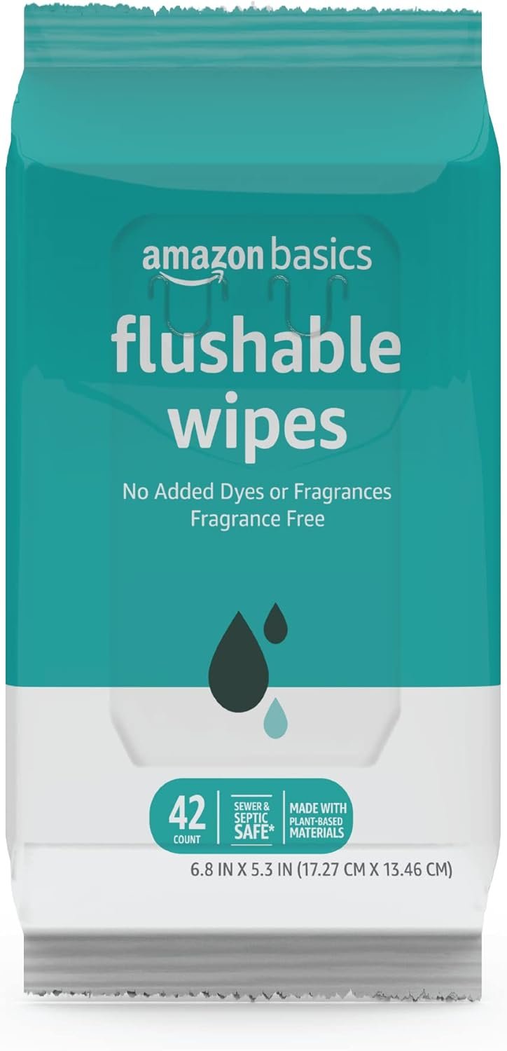 Amazon Basics Flushable Adult Toilet Wipes, Fragrance Free, 126 Count, 100% biodegradable wipes when disposed of in the toilet, are made with plant-based fibers and plastic-free