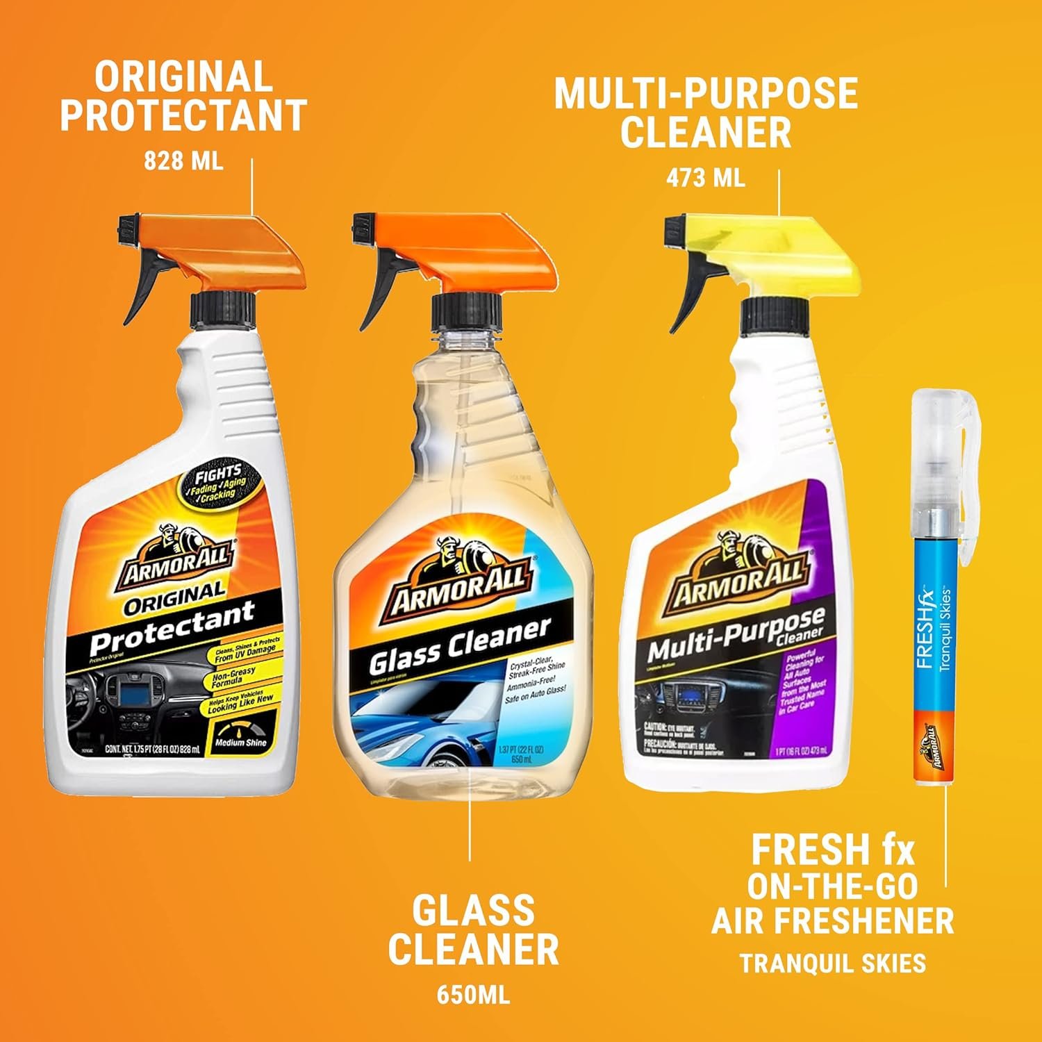 Armor All Premium Car Care Kit keeps your vehicle’s interior and exterior surfaces clean with a showroom shine. Start with your vehicle’s interior using the Armor All Multi-Purpose Cleaner, an all-in-one car cleaning solution effective for the whole car to provide a “just-detailed” look by removing dirt, dust and grime. After, use Armor All Original Protectant to clean dirt, dust and debris from your vehicle’s interior and prevent surfaces from premature aging. Make sure you use the Armor All FreshFX Tranquil Skies Car Air Freshener to leave behind a refreshing car scent. Move to the outside with Armor All Glass Cleaner to easily remove filmy residue, road grime, bugs, fingerprints and more from your car windows for incredible clarity and shine. Use the Armor All Ultra Shine Wash and Wax to give a beautiful car shine while gently lifting away dirt to reveal your paint’s deep, radiant color. Follow up with Armor All Microfiber Wash Pad to lift and attract dirt and bugs on your vehicle’s exterior surfaces. Finally, use Armor All Tire Shine to deliver intense, mirror-like shine and the Armor All Extreme Tire and Wheel Cleaner to attack grease, road grime and brake dust. Trust in Armor All.
