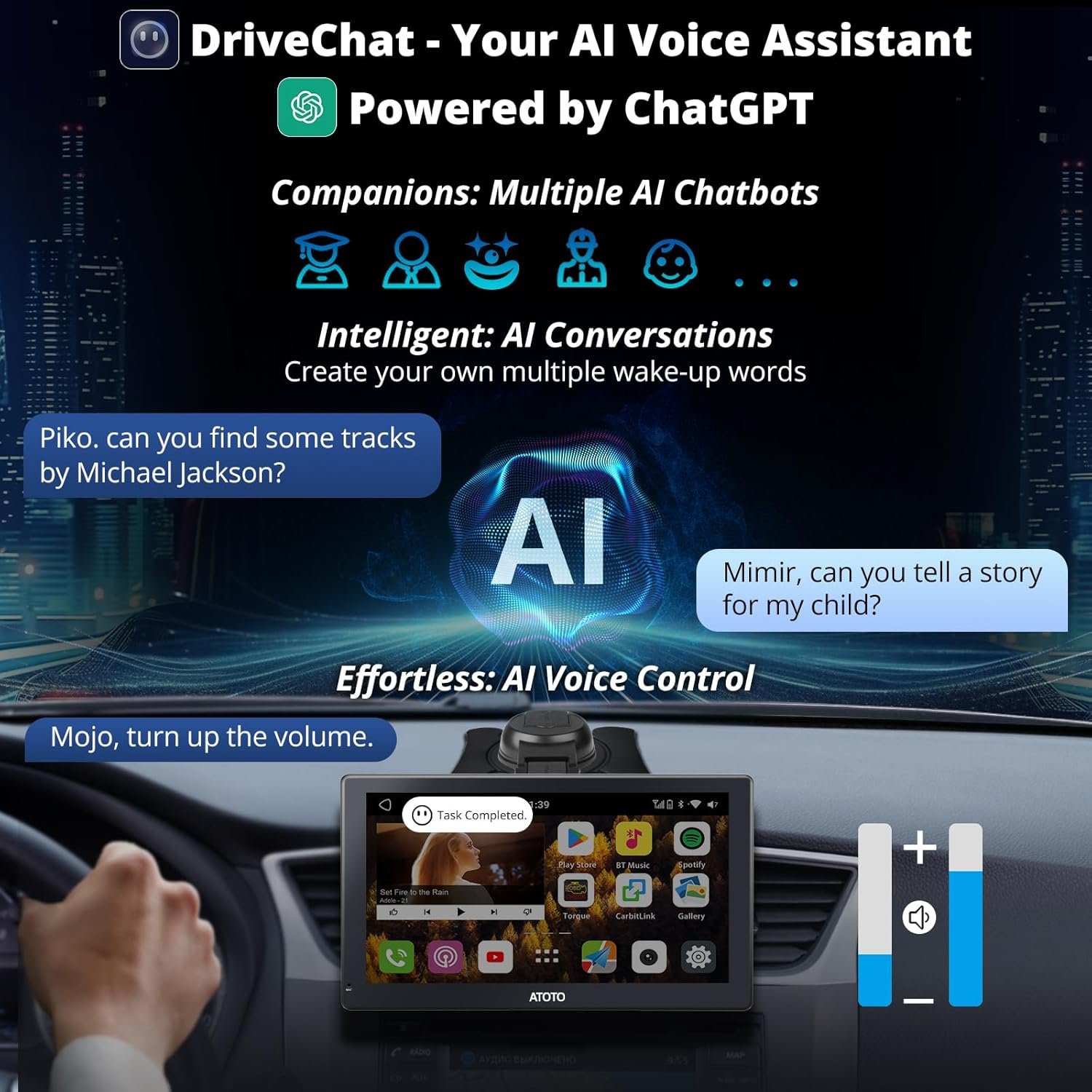DriveChat – AI Driving Assistant: Voice Assistant powered by ChatGPT for operating without touching; manage calls, music, and more with voice commands; multiple chatbot options for personalized guidance; customizable wake words for tailored interactions