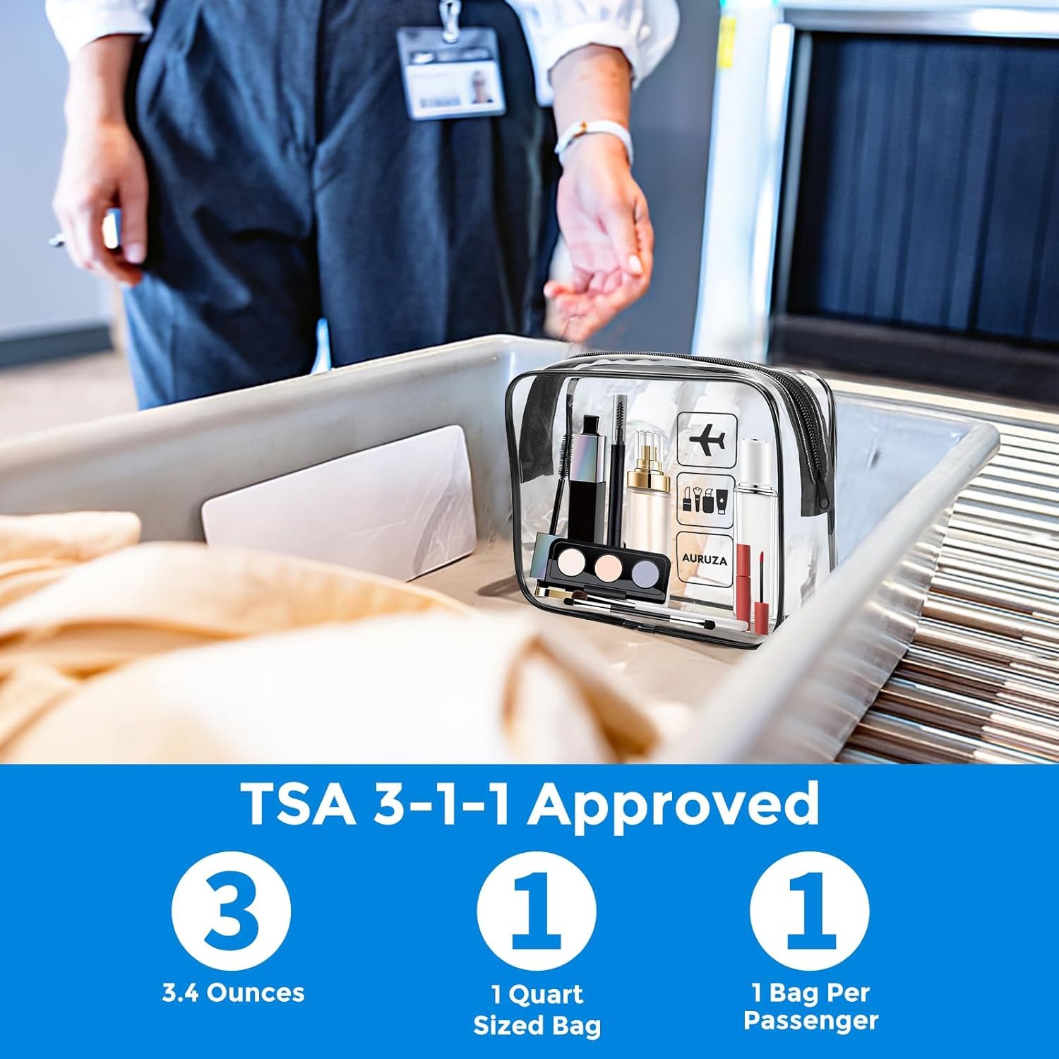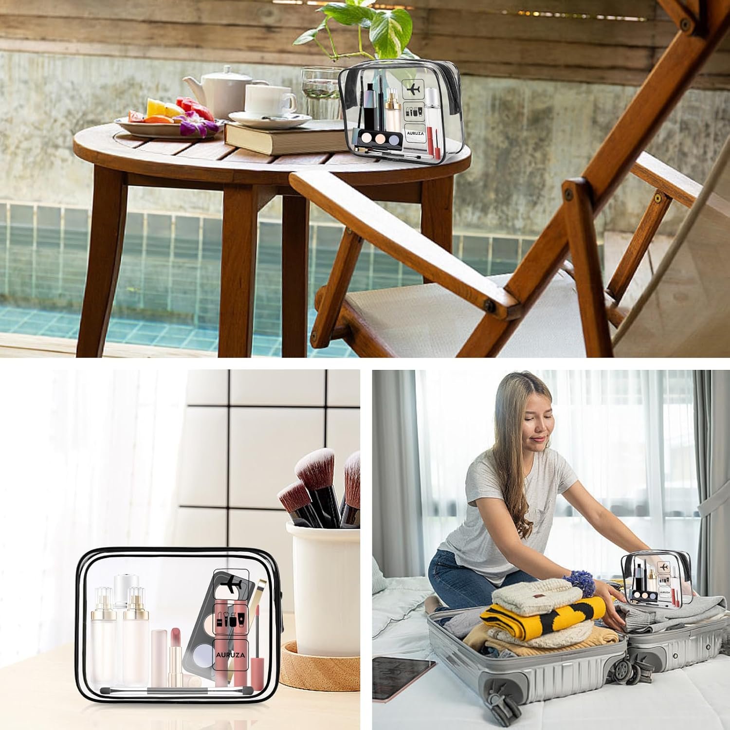 AURUZA 2 Pack TSA Approved Toiletry Bag, Clear Makeup Bag,Travel Cosmetic Bag with Zipper,Clear Organizer Carry on Bag for Women,PVC Cosmetic Pouch for Airport Airline Compliant (Black)