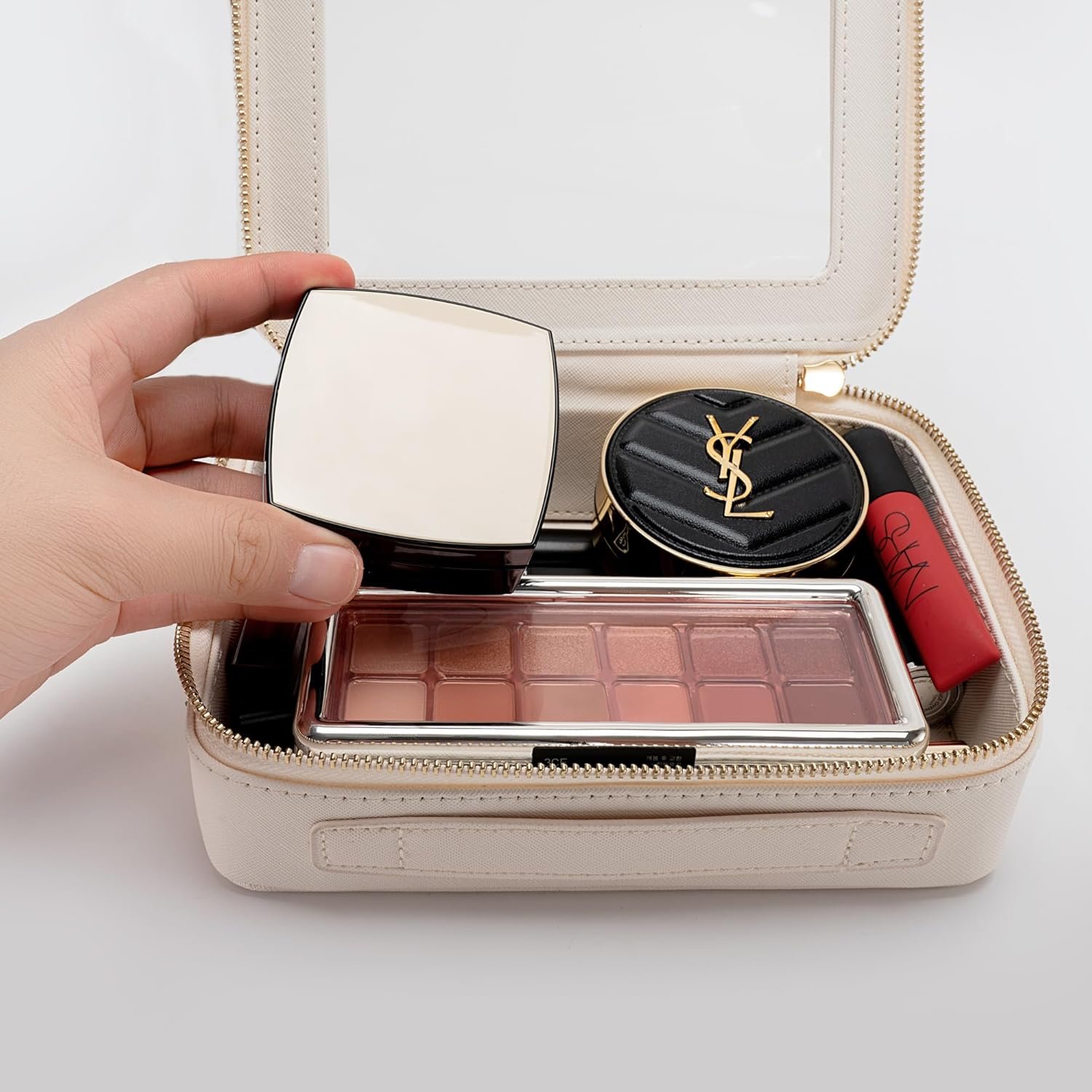 ❤【LUXURY DESIGN】Measuring 7.9” x 5.7” x 2.7”(20 cm x14.5cm x 7cm), our clear makeup bag is leek and stylish, this makeup travel organizer was designed in a minimalist boxy shape and a sweet off-white color. Crafted in beautiful PU leather and finished with polished hardware, it’s the clear pouch you’d be happy with sitting out on display beside you.