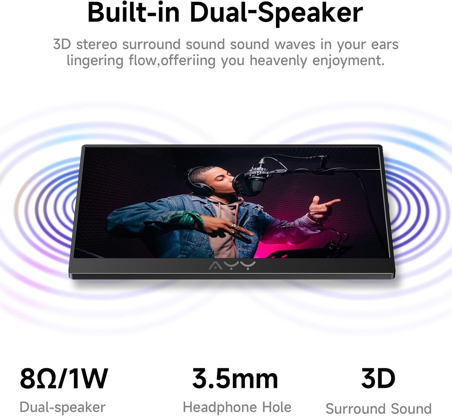 【VESA Mountable & Dual Speakers &3.5mm Audio Jack】With VESA holes, you can easily mount the portable gaming monitor to a stand for landscape and portrait mode to mirror/extend the screen for high productivity and efficiency. The built-in speakers give you free access to video, games, movies, And you can add your own speaker or headphones for better sound performance with a 3.5mm audio jack