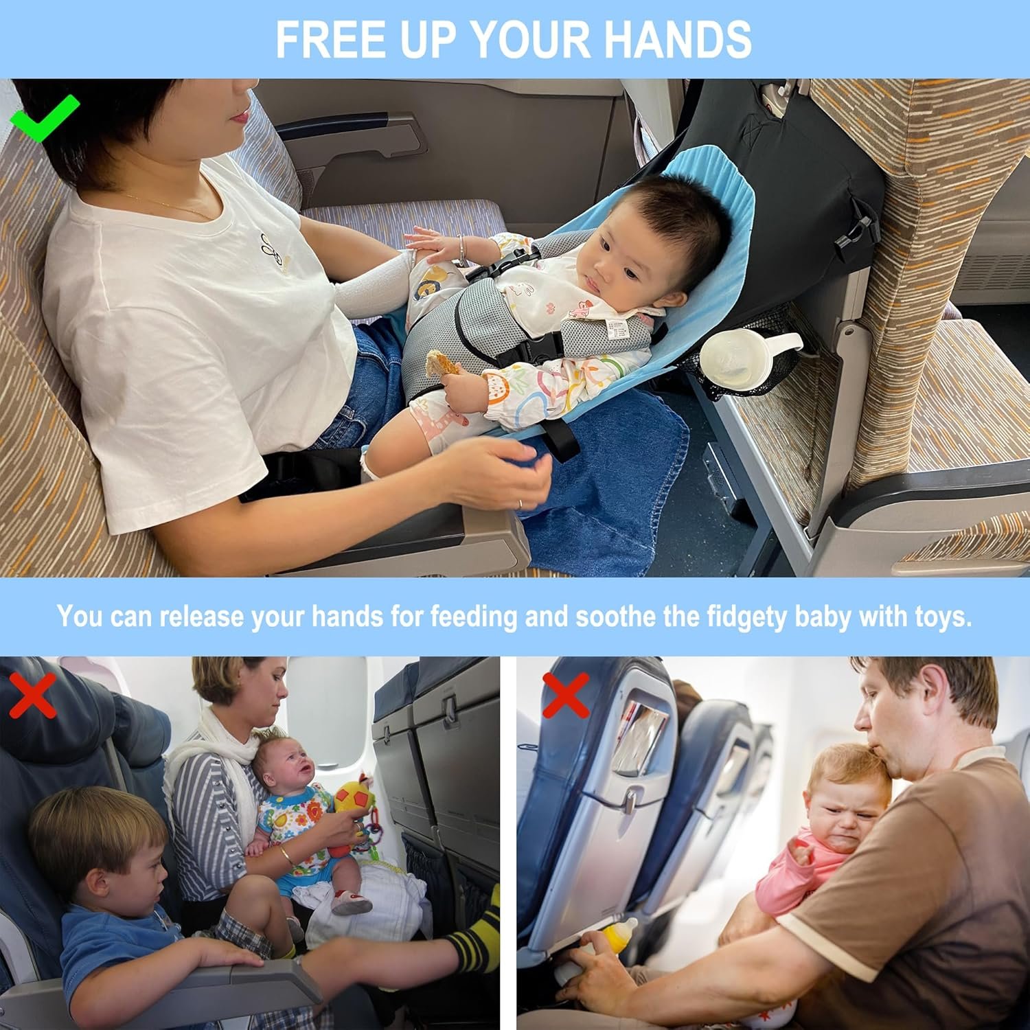 🛫[Free Your Hands]: We absolutely recommend getting this baby airplane bed if you plan on flying long distances with an infant in your arms. You can release your hands for feeding and soothe the fidgety baby with toys. The ability to have eye contact with your infant while flying is beneficial too.
